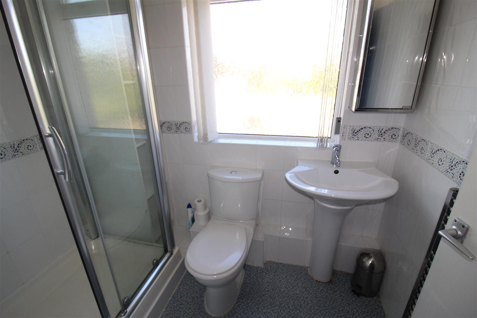 Three piece suite with comprising, pedestal wash hand basin, shower enclosure with electric shower and glass screen and low-level WC, full height ceramic tiling to all walls, heated towel rail, wall mounted, mirrored cabinet, uPVC frosted double glazed window to rear.