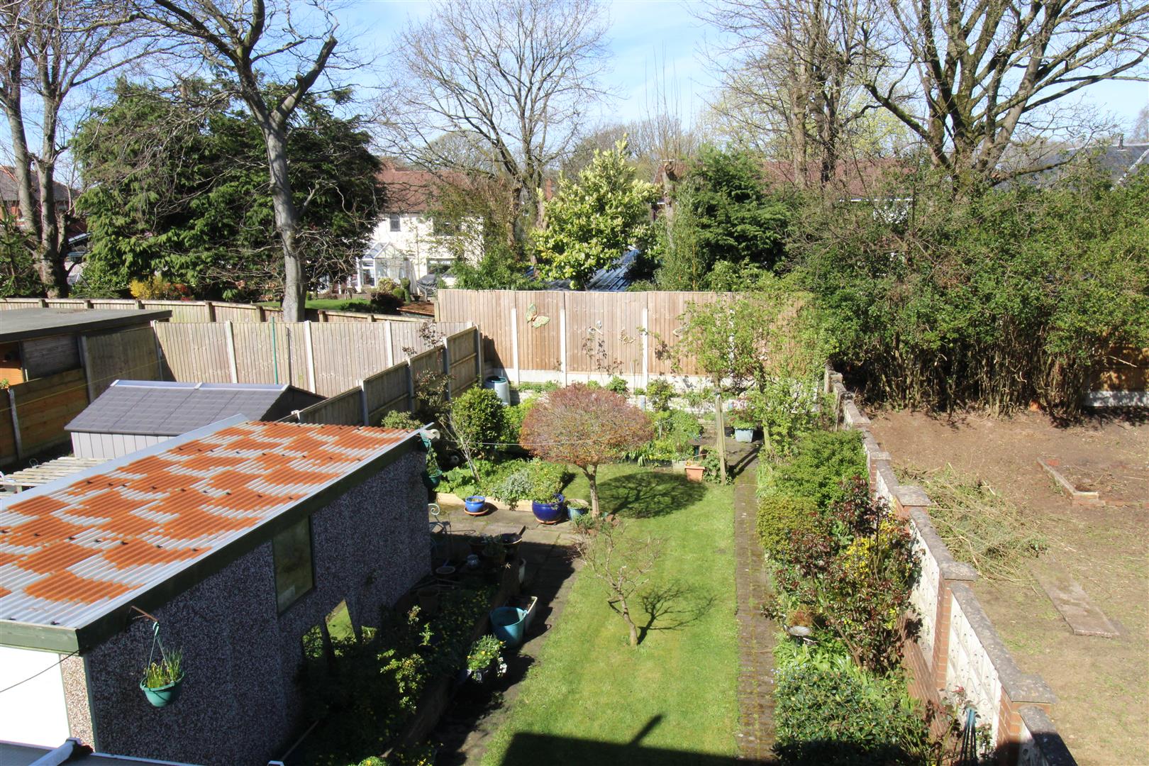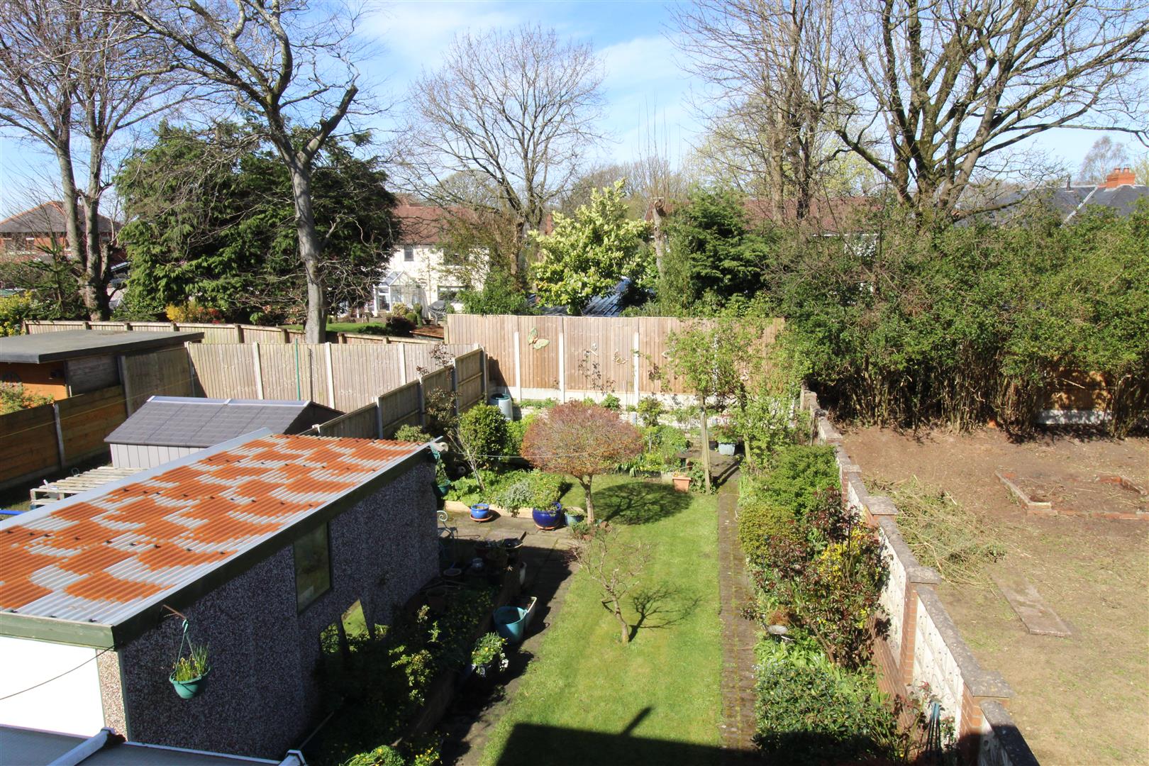Enclosed rear laid to lawn with mature planting and patio seating area