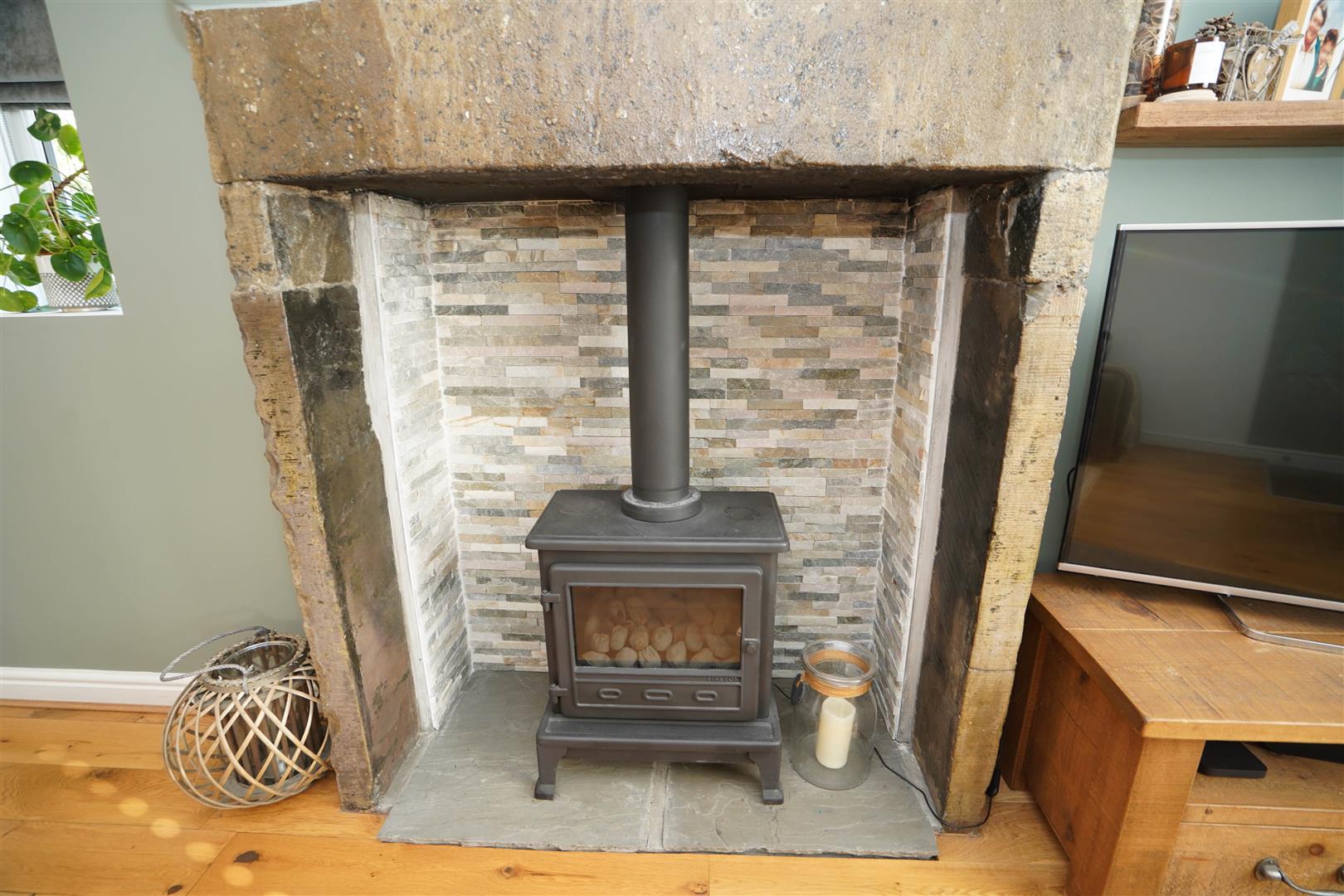 UPVC double glazed window to front, uPVC double glazed window to side, open fire set in stone built log effect gas fire set in stone built surround, double radiator, :