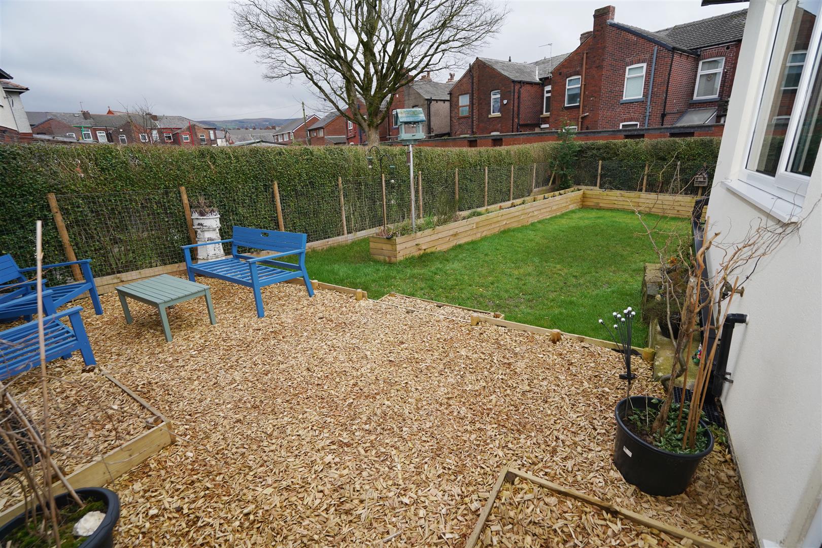 Rear Garden with large lawned area raised flower and vegetable beds enclosed by fencing and hedges to rear and side large storage shed / workshop with power and light connected.