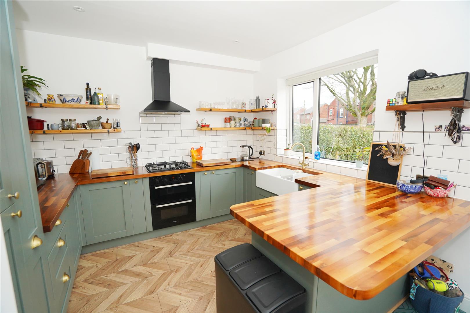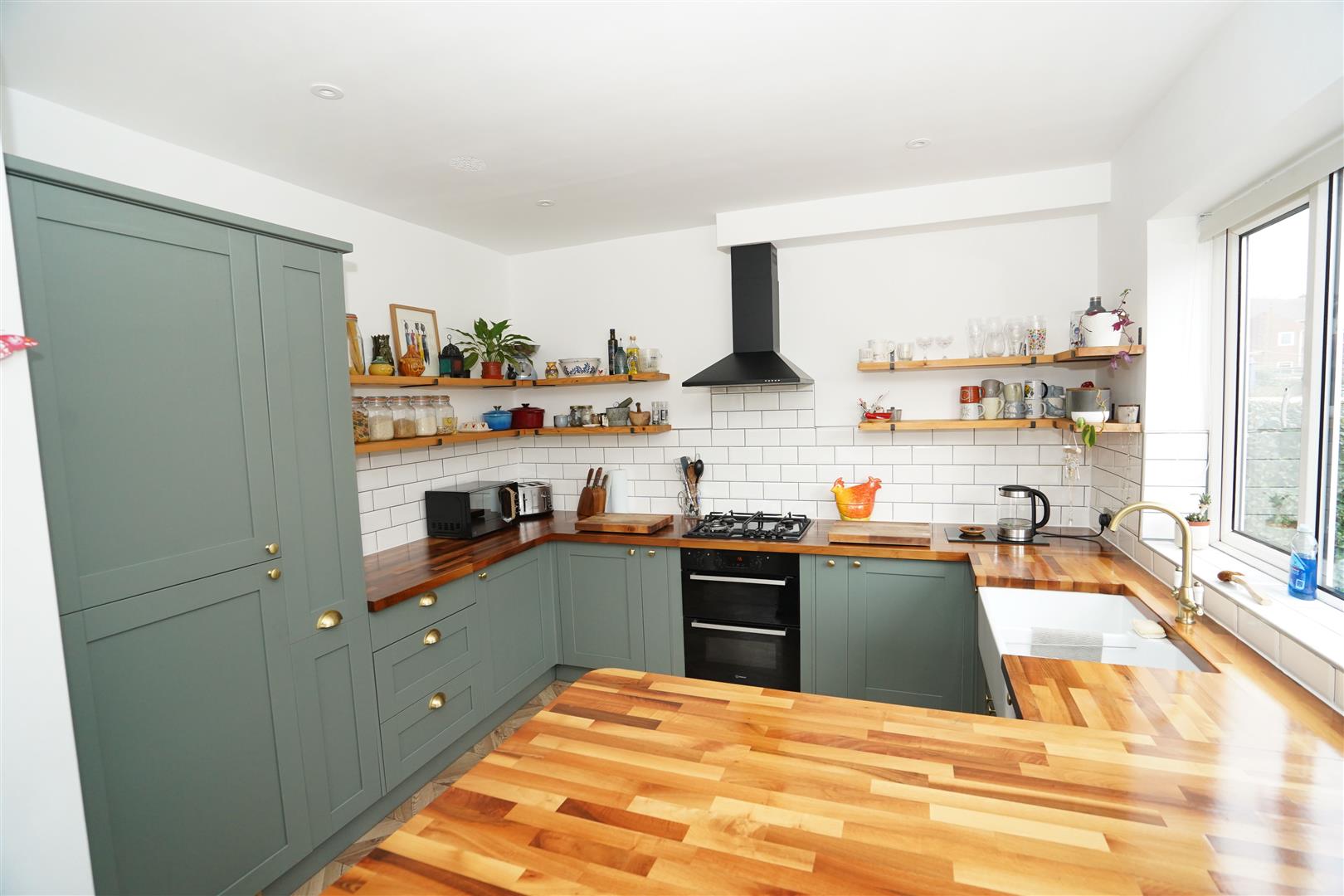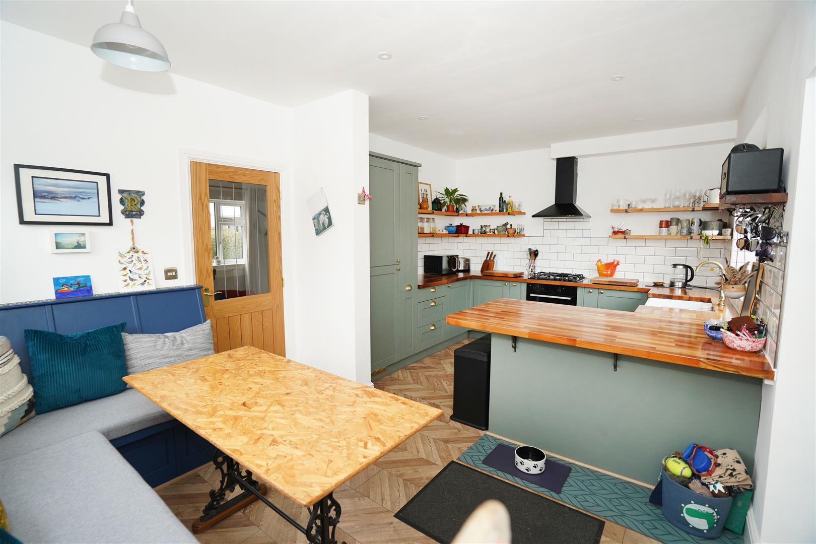 Fitted with a matching range of modern green base and eye level units with contrasting wood worktop space, twin bowl china sink unit with swan neck mixer tap pull out ladder cupboards, integrated fridge/freezer and washing machine, built-in electric fan assisted double oven, four ring gas hob with extractor hood over, uPVC double glazed window to side, two uPVC double glazed windows to rear, laminate flooring, Fitted booth seating, door.