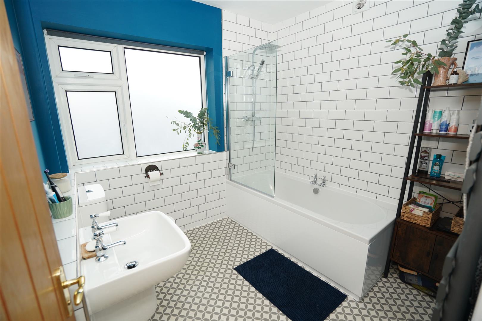 Fitted with three modern white suite comprising deep panelled bath with shower over and glass screen, wall mounted wash hand basin and low-level WC, ceramic tiling to three walls, heated towel rail, extractor fan, uPVC frosted double window to rear, vinyl flooring.