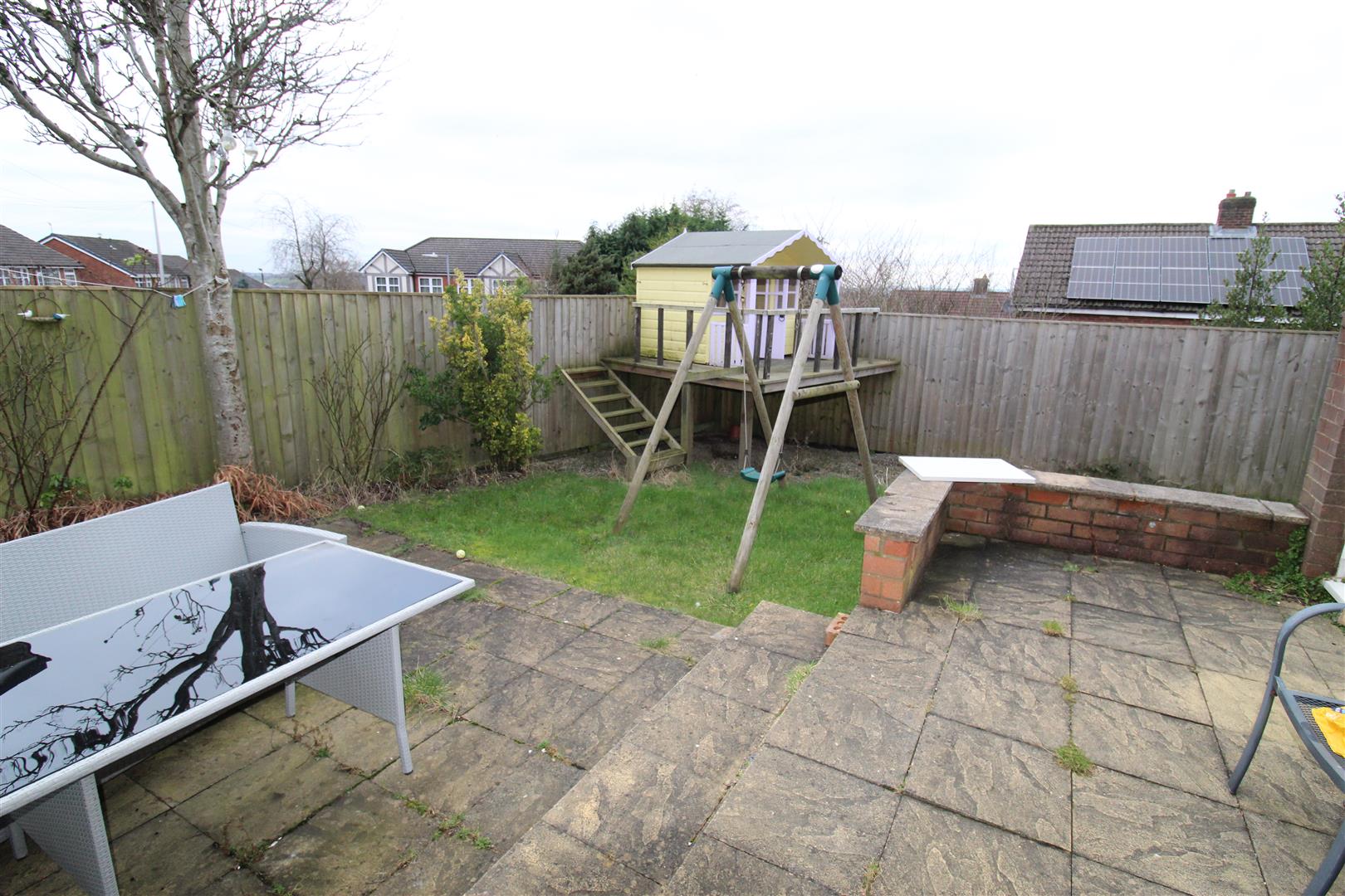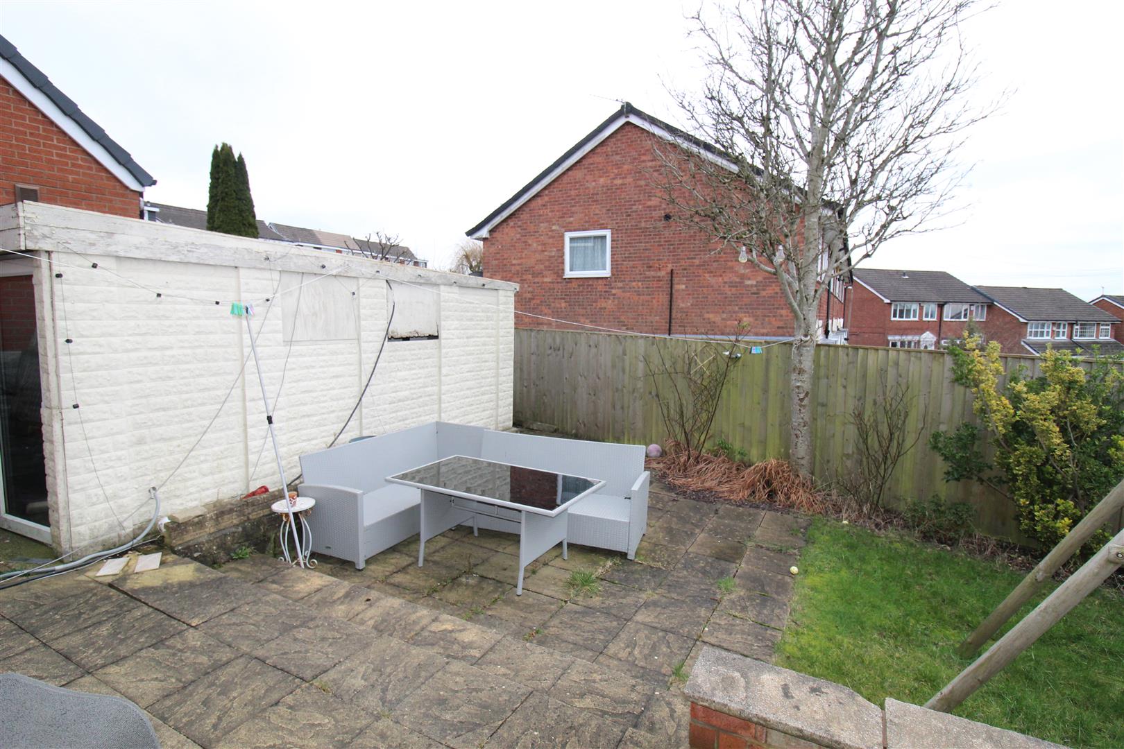 Enclosed rear garden with patio dining area.