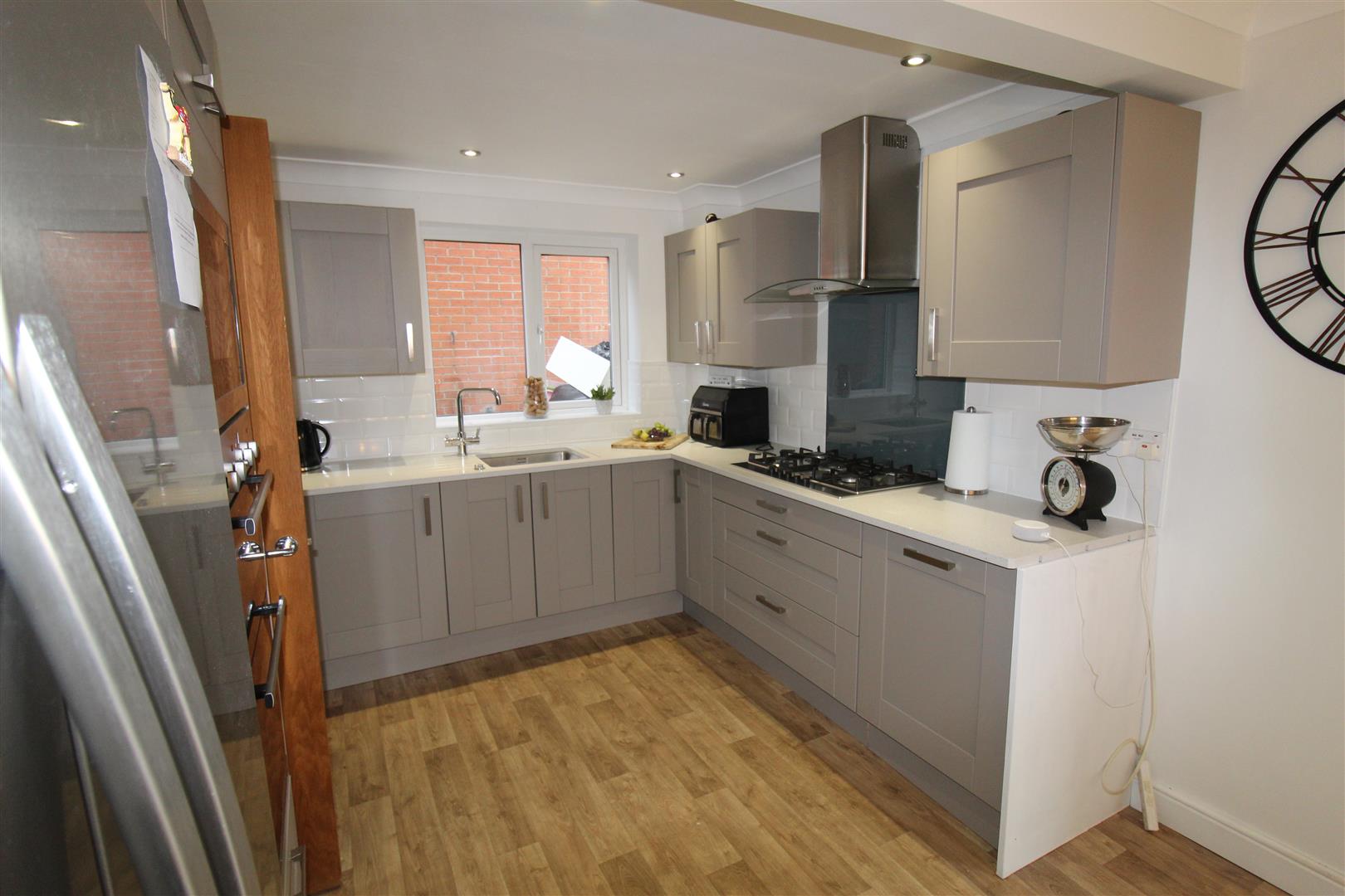Fitted with a matching range of base and eye level units with worktop space over with drawers and acrylic worktops, stainless steel belfast sink with single drainer, mixer tap and tiled splashbacks, dishwasher, space for fridge/freezer, built-in eye level electric fan assisted oven, built-in five ring gas hob with extractor hood over, built-in microwave, uPVC double glazed window to side, column radiator, uPVC double glazed entrance double door to rear.