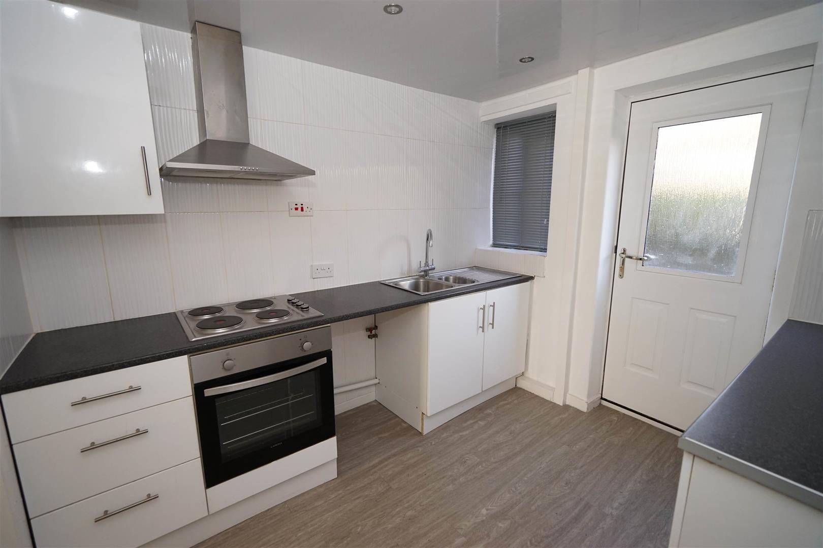 Fitted with a matching range of white base and eye level units with drawers and contrasting round edged worktops, 1+1/2 bowl stainless steel sink unit with single drainer and mixer tap with tiled splashbacks, plumbing for washing machine, space for fridge/freezer, built-in electric fan assisted oven, four ring ceramic hob with extractor hood over, uPVC double glazed window to rear, vinyl flooring, Composite double glazed door to garden, door to: