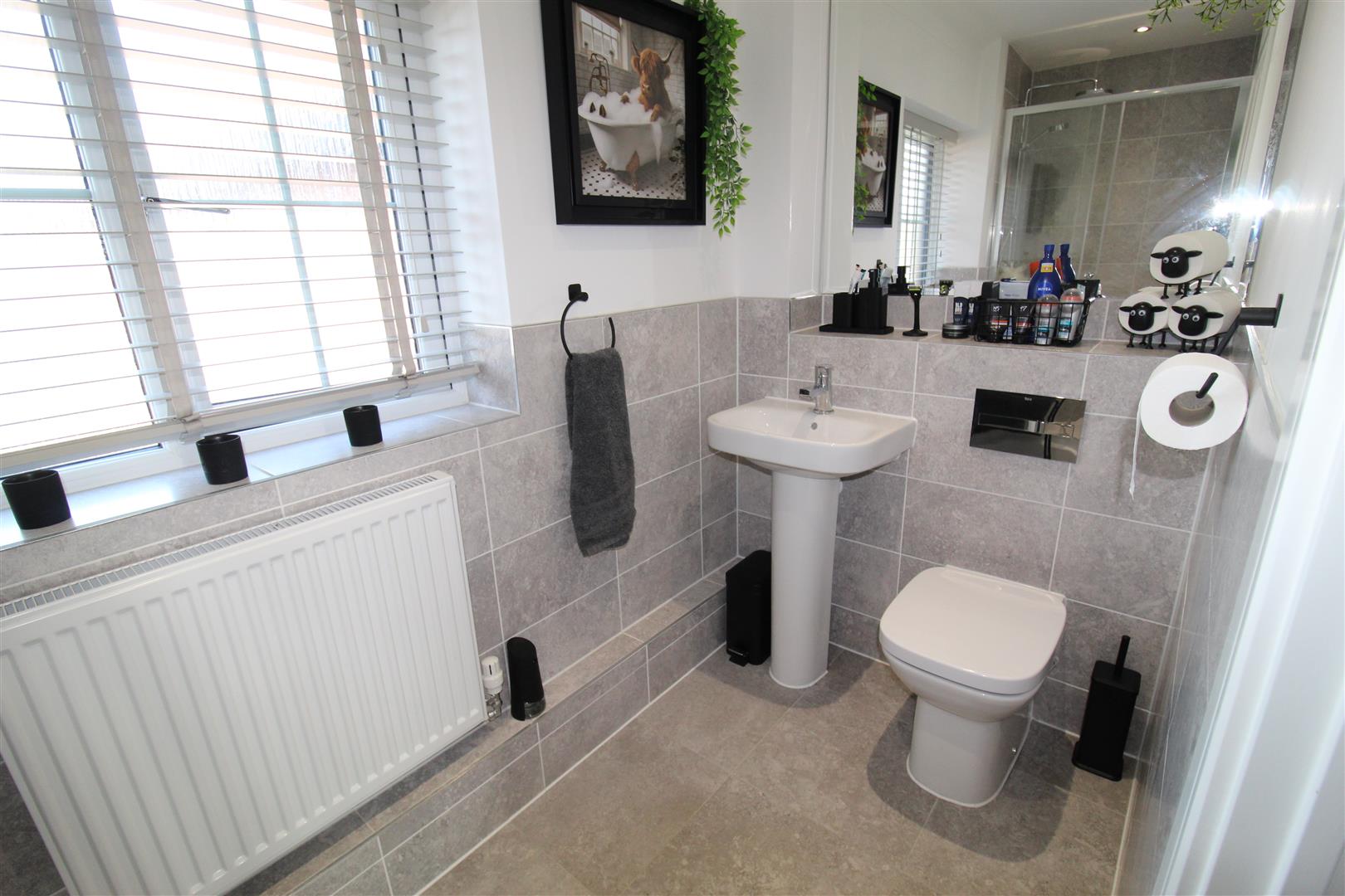 Three piece suite with comprising, pedestal wash hand basin and close coupled WC, extensive ceramic and tiling, extractor fan, uPVC frosted double glazed window to rear, radiator, ceramic tiled flooring.