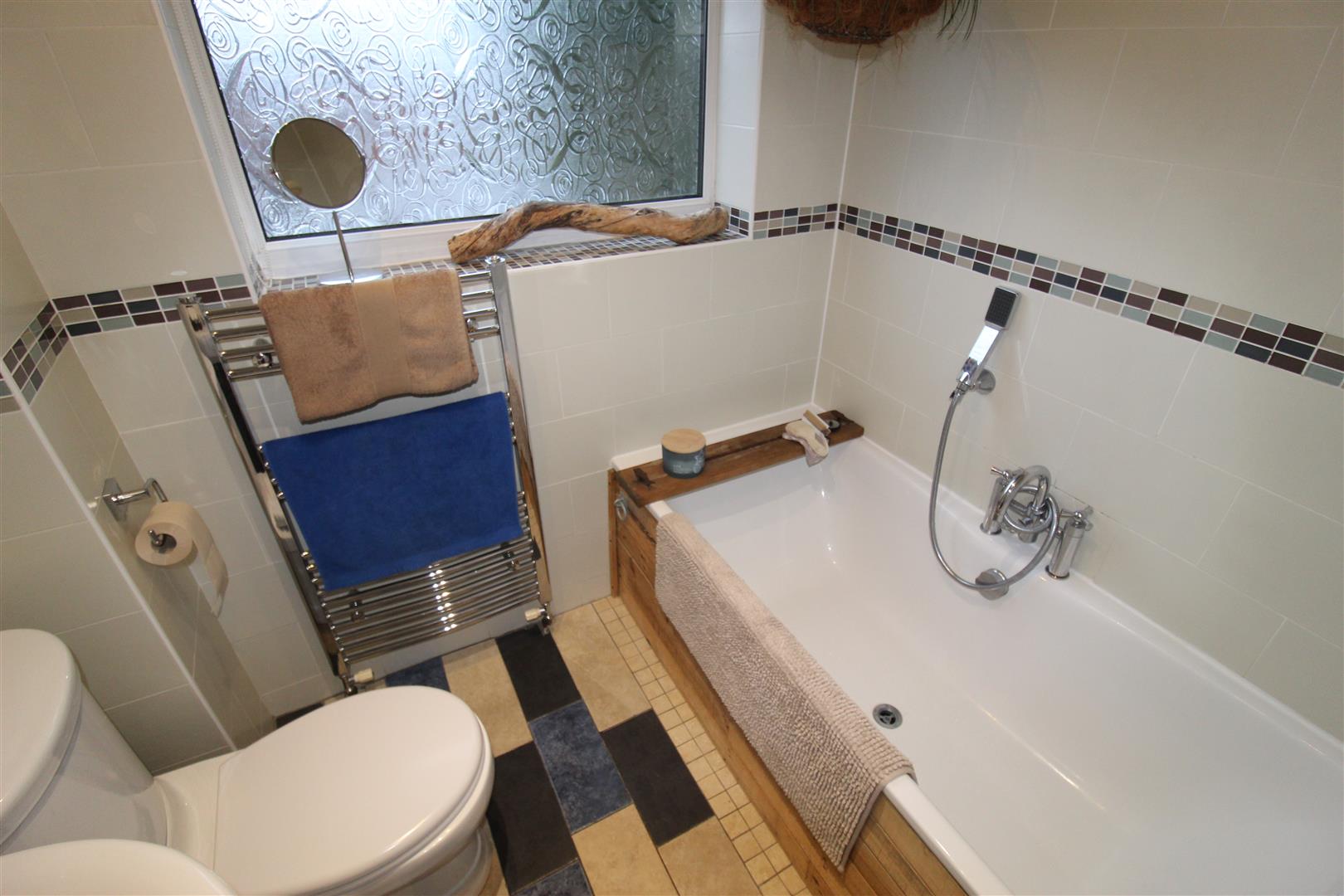 Three piece suite comprising deep panelled bath, pedestal wash hand basin with full height ceramic tiling to all walls, shower with over and low-level WC, uPVC frosted double glazed window to rear, heated towel rail.