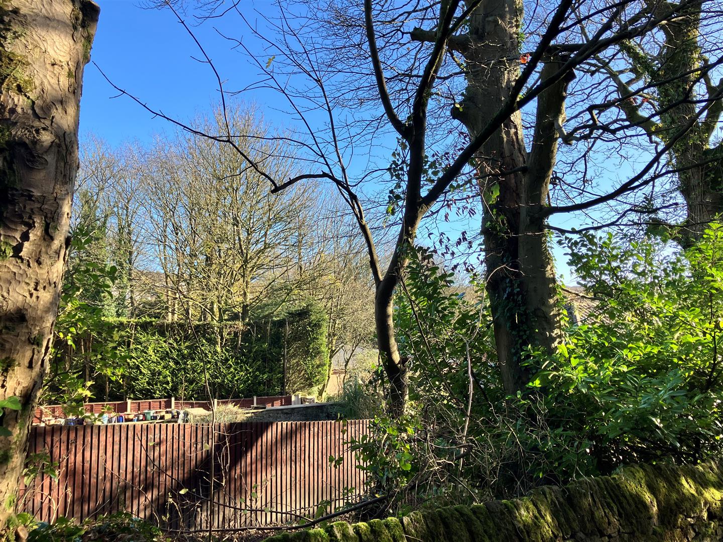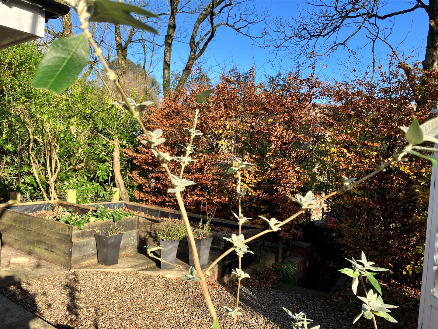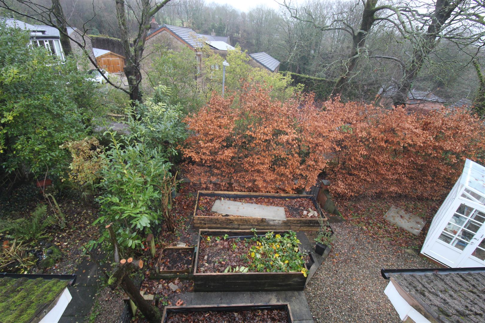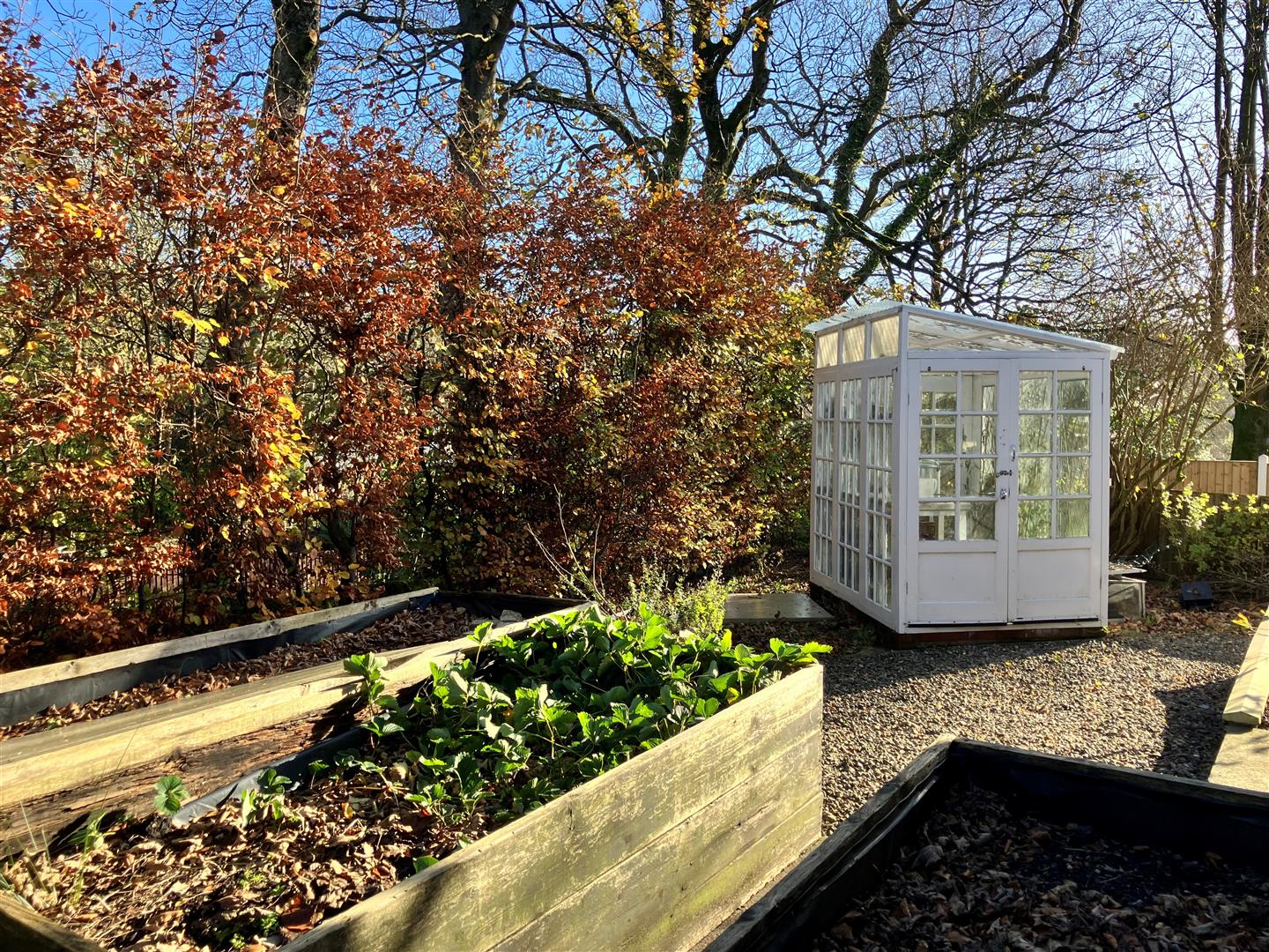 Enclosed rear garden area with mature planting and pathway leading to garage.