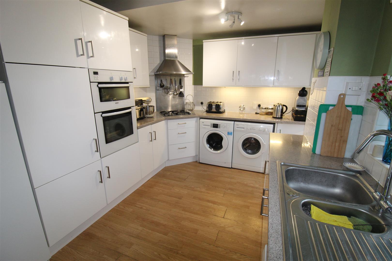 Fitted with a matching range of base and eye level units with worktop space over with underlighting, drawers, cornice trims and round edged worktops, 1+1/2 bowl stainless steel sink unit with single drainer and mixer tap, plumbing for automatic washing machine and dishwasher, vent for tumble dryer, space for fridge/freezer, fitted built-in eye level electric fan assisted oven, built-in four ring gas hob with extractor hood over, uPVC double glazed window to rear, uPVC double glazed frosted entrance door to rear,: