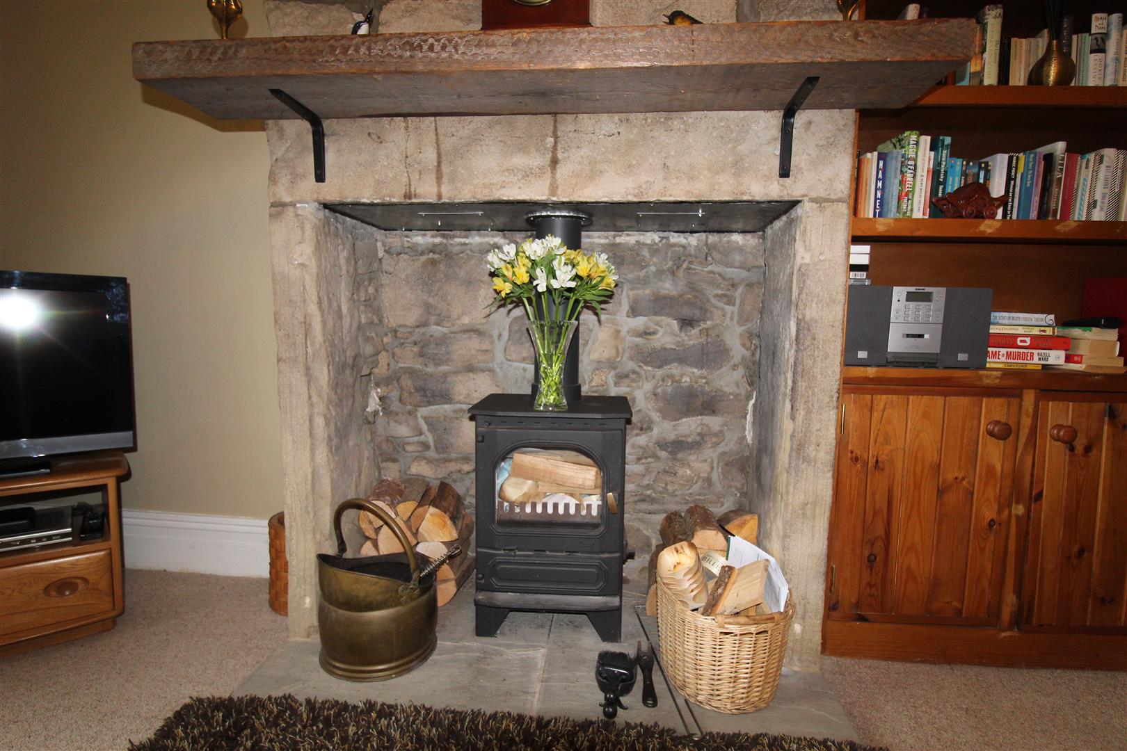 UPVC double glazed window to front, cast- iron solid fuel burner stove with glass door in chimney breast, two double radiators, stairs, :