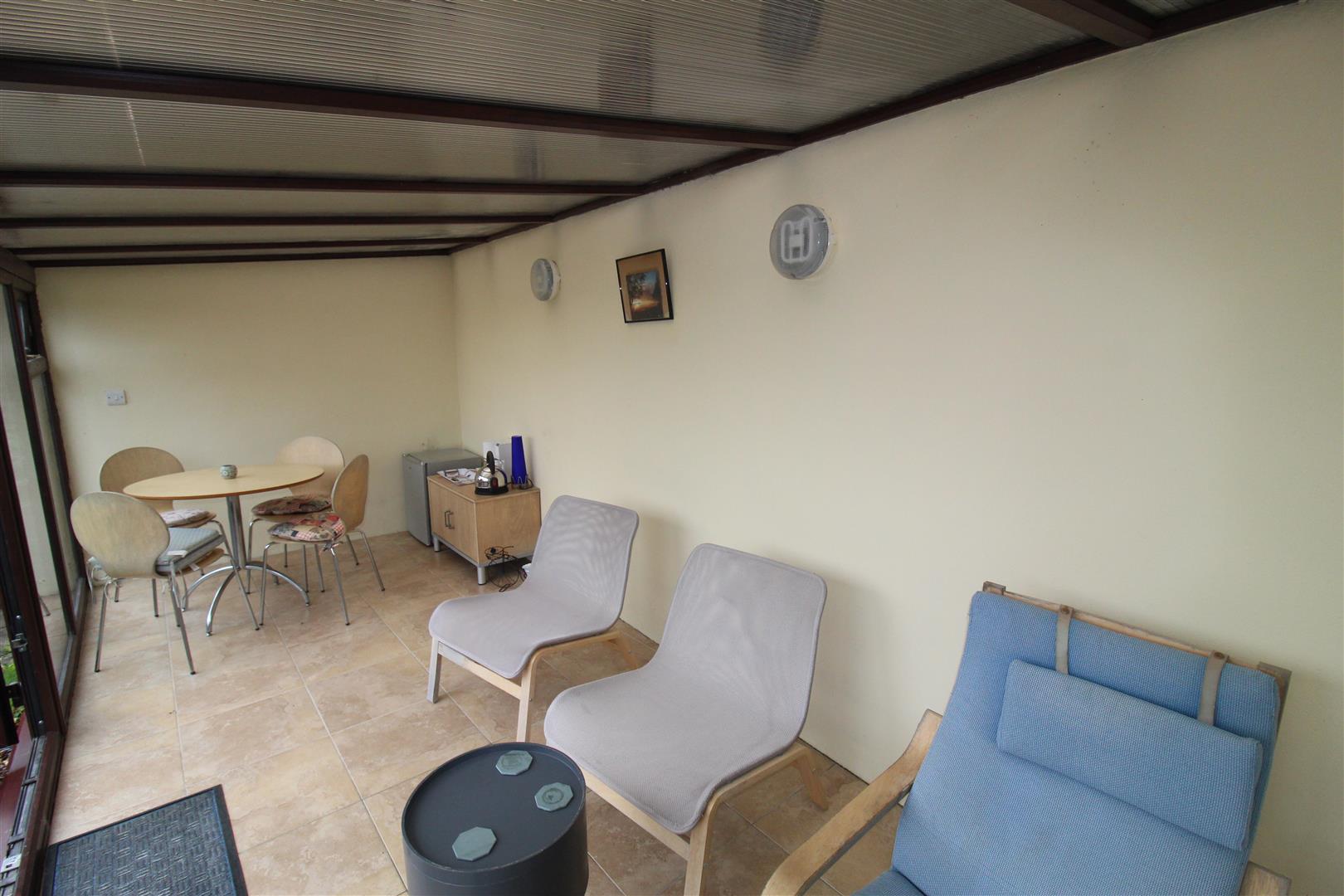 Private enclosed garden with garden room, lawn area mature planting of shrubs and plants, pond , garden shed, patio seating and dining areas.