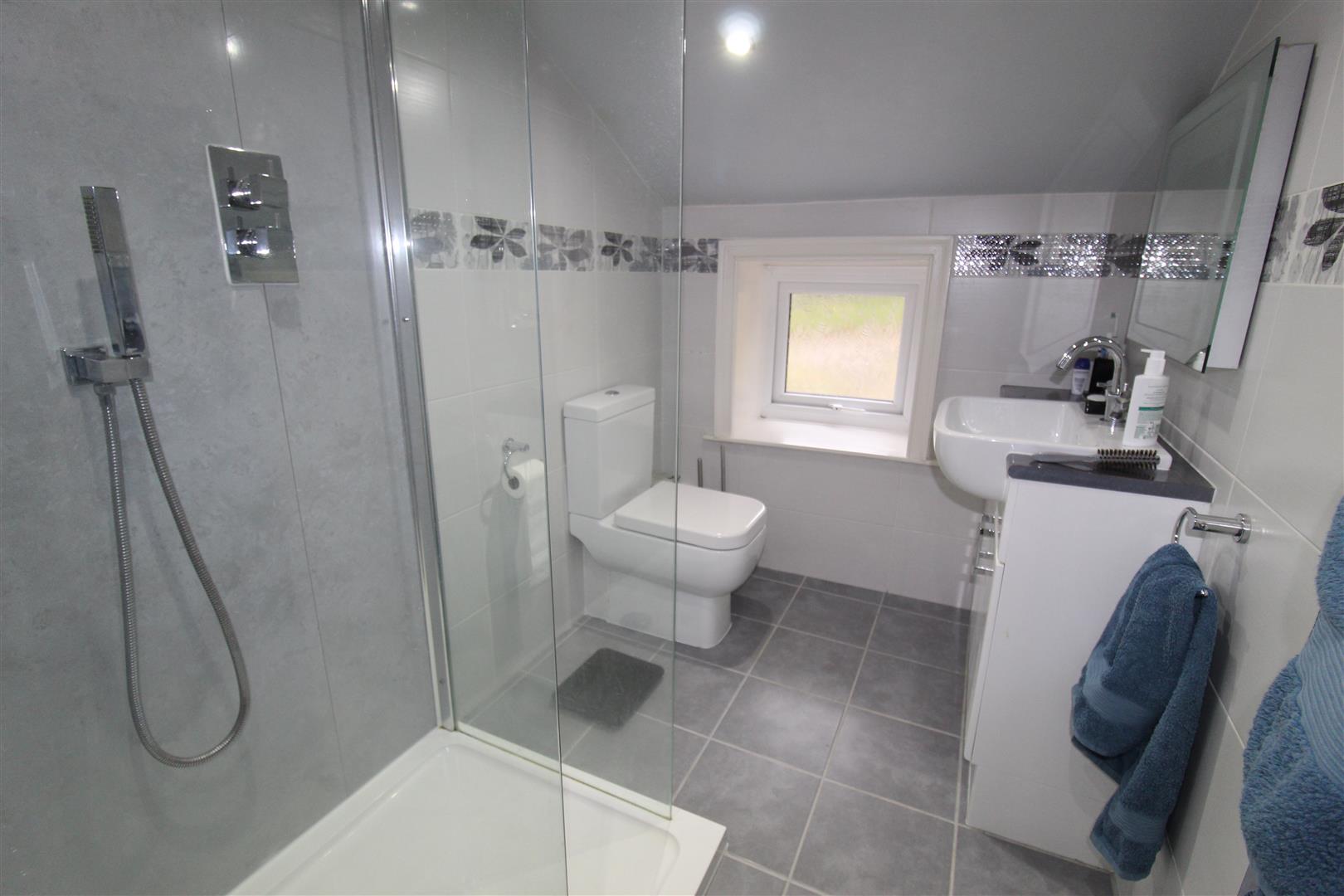 Three piece suite comprising, wash hand basin in vanity unit with cupboard under, mixer tap and full height ceramic tiling to all walls and low-level WC, shower cubical with glass screen, uPVC frosted double glazed window to rear, heated towel rail :