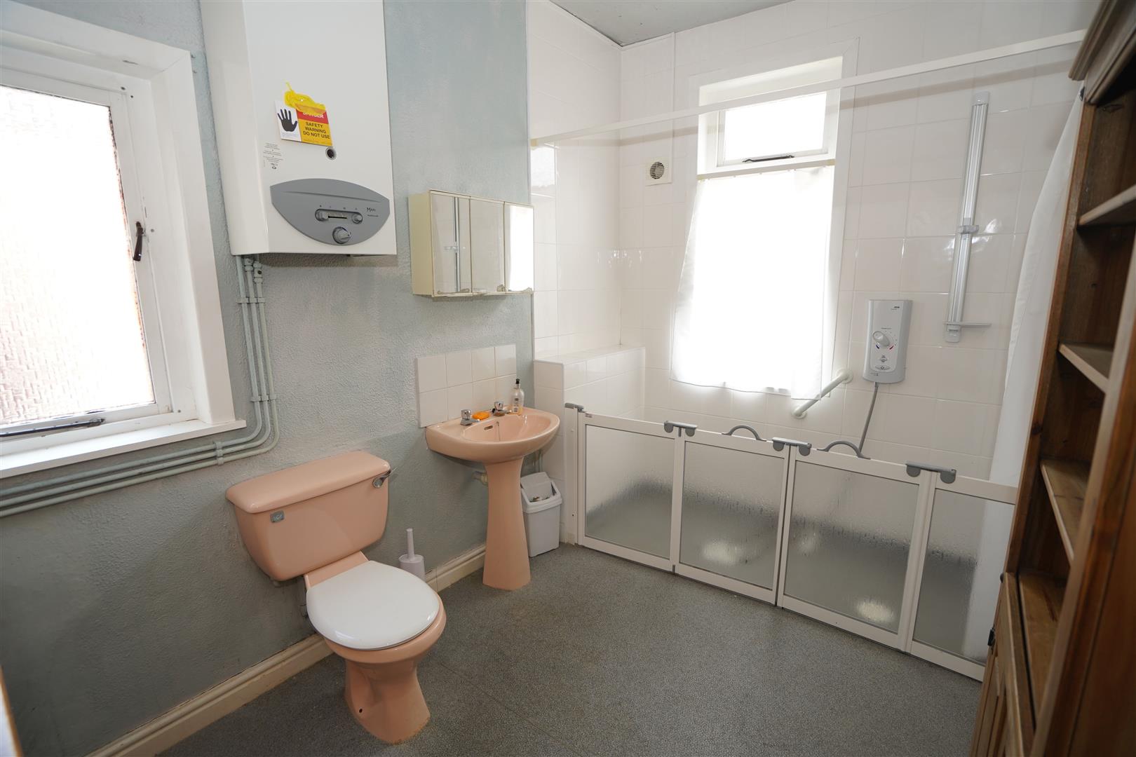 Three piece coloured suite comprising tiled shower area with electric shower over, pedestal wash hand basin with tiled splashback, low-level WC and full height ceramic tiling to three walls, electric fan heater, frosted sealed unit double glazed window to rear, frosted sealed unit double glazed window to side.