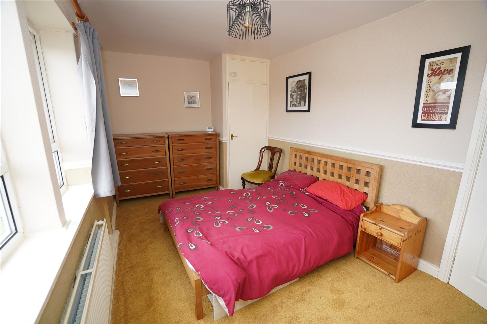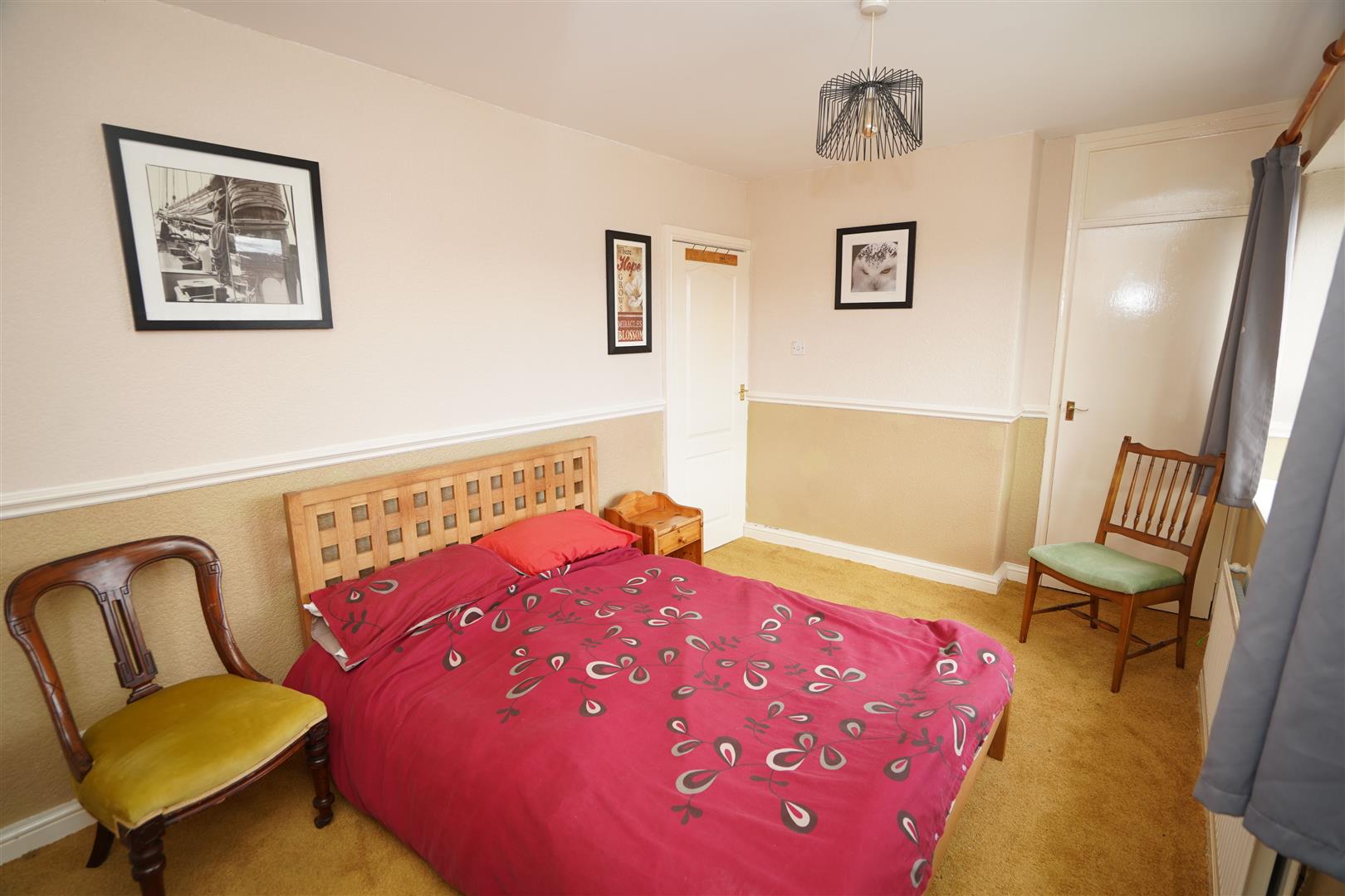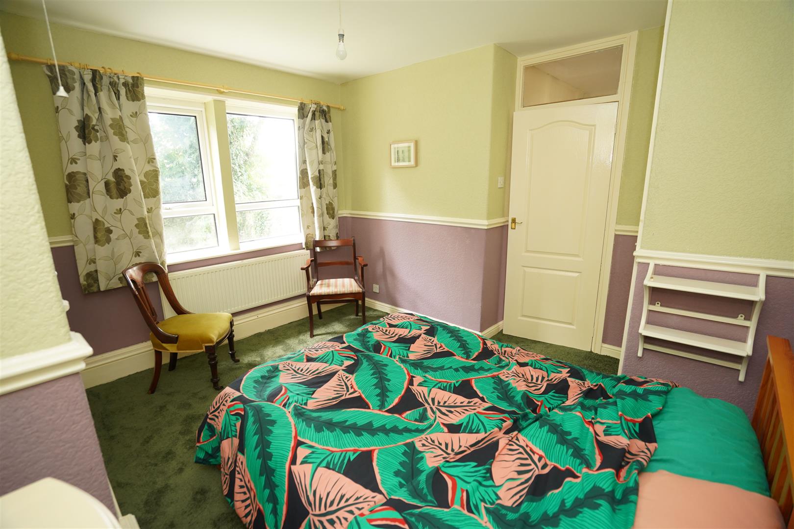 Two uPVC double glazed windows to rear, built-in double wardrobe(s) with hanging rails and shelving, built-in storage cupboard, double radiator, dado rail, double door, door to:
