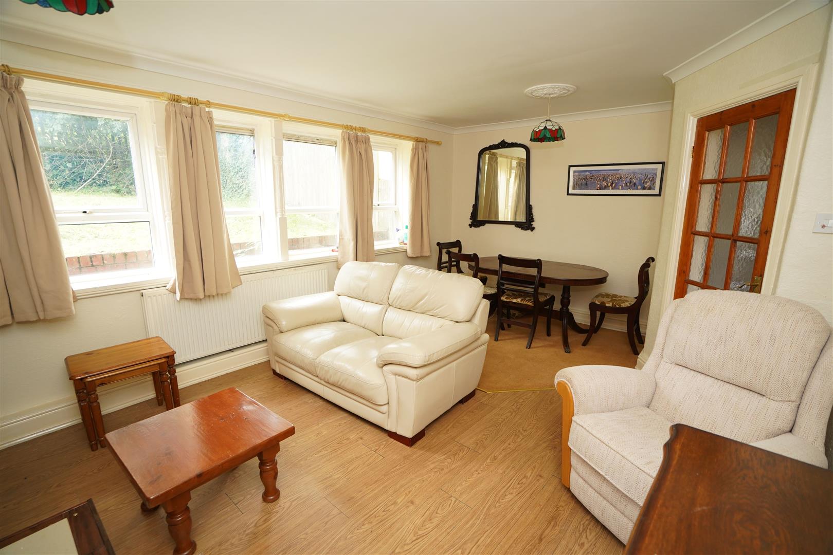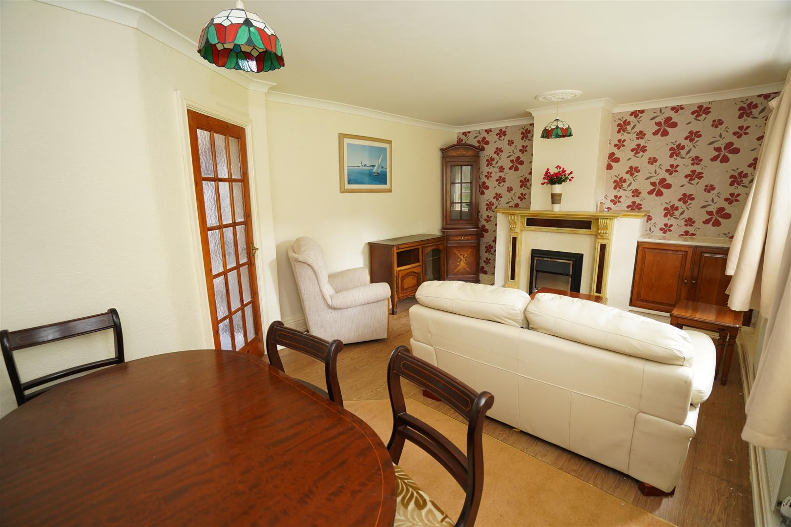 Four uPVC double glazed windows to rear, living flame effect electric fire set in feature surround, double radiator, laminate flooring, coving to ceiling.