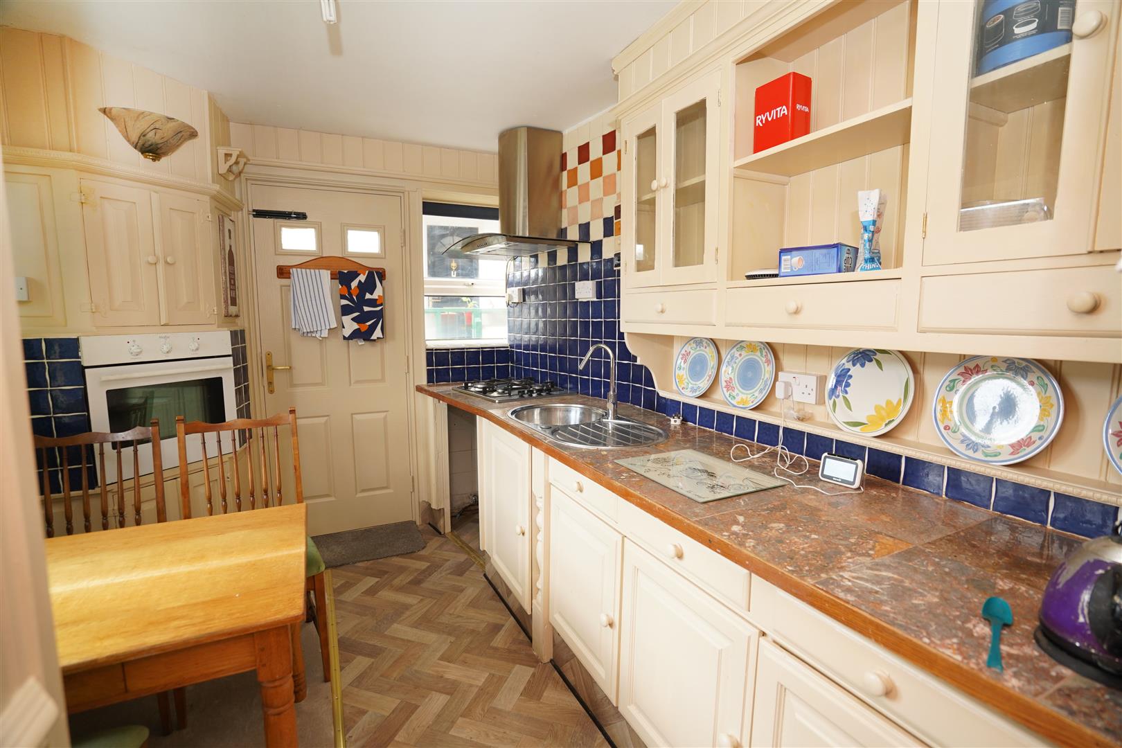 Base and eye level cupboards with worktop space over, stainless steel sink unit with single drainer and mixer tap with tiled splashbacks, plumbing for washing machine, space for fridge, built-in eye level electric fan assisted oven, four ring gas hob with extractor hood over, two uPVC double glazed windows to front, uPVC double glazed window to side, built-in storage cupboard, double radiator, door to: