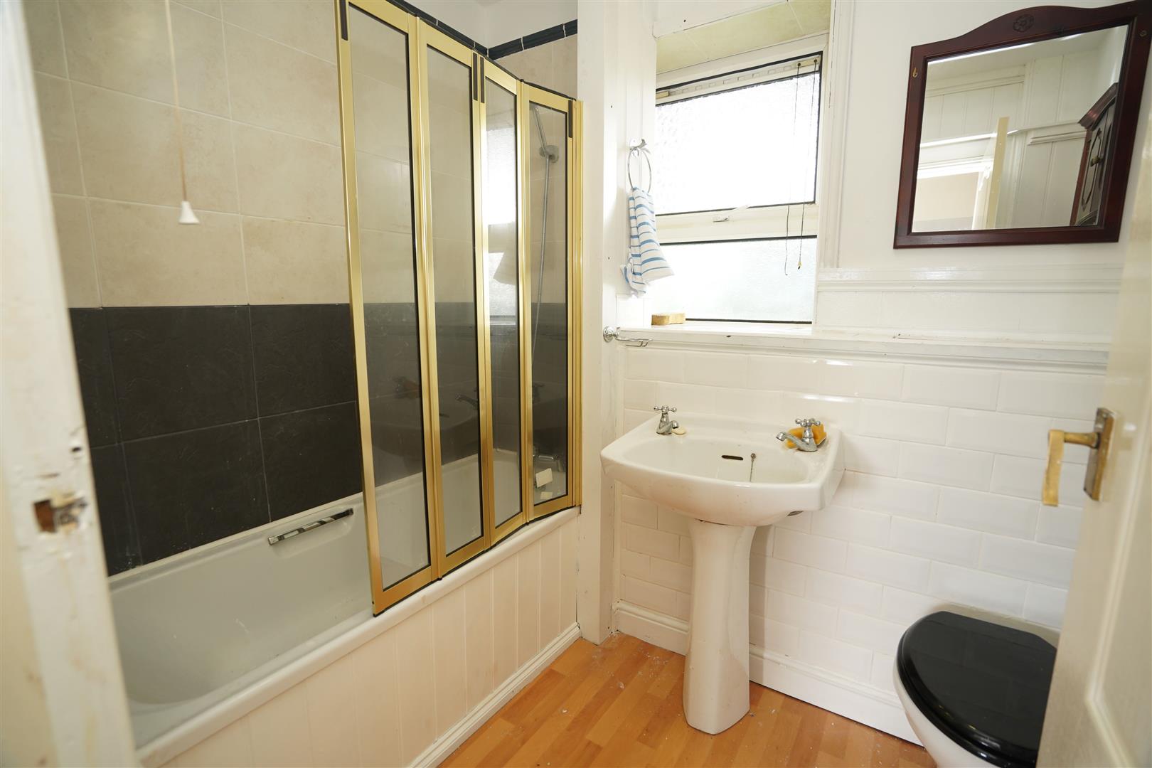 Fitted with three piece white suite comprising deep panelled bath with shower over and folding glass screen and pedestal wash hand basin, WC with hidden cistern, ceramic tiling to three walls, uPVC frosted double glazed window to rear, radiator.