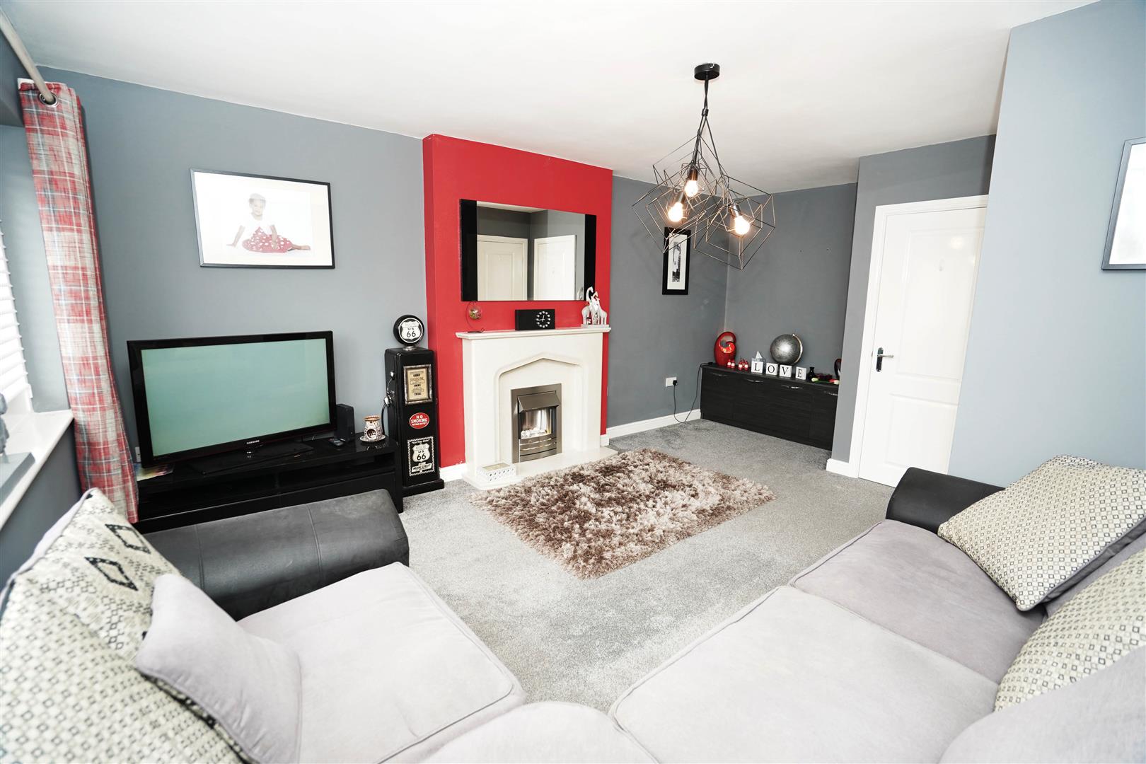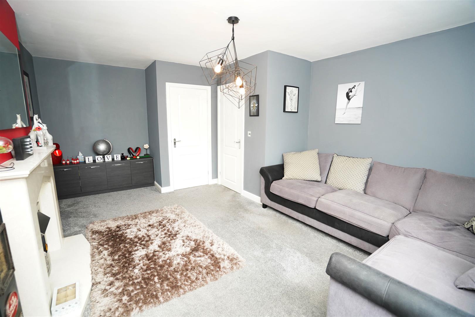 UPVC double glazed window to front, log effect electric fireplace with set in and feature surround, Storage cupboard, double radiator, door to: