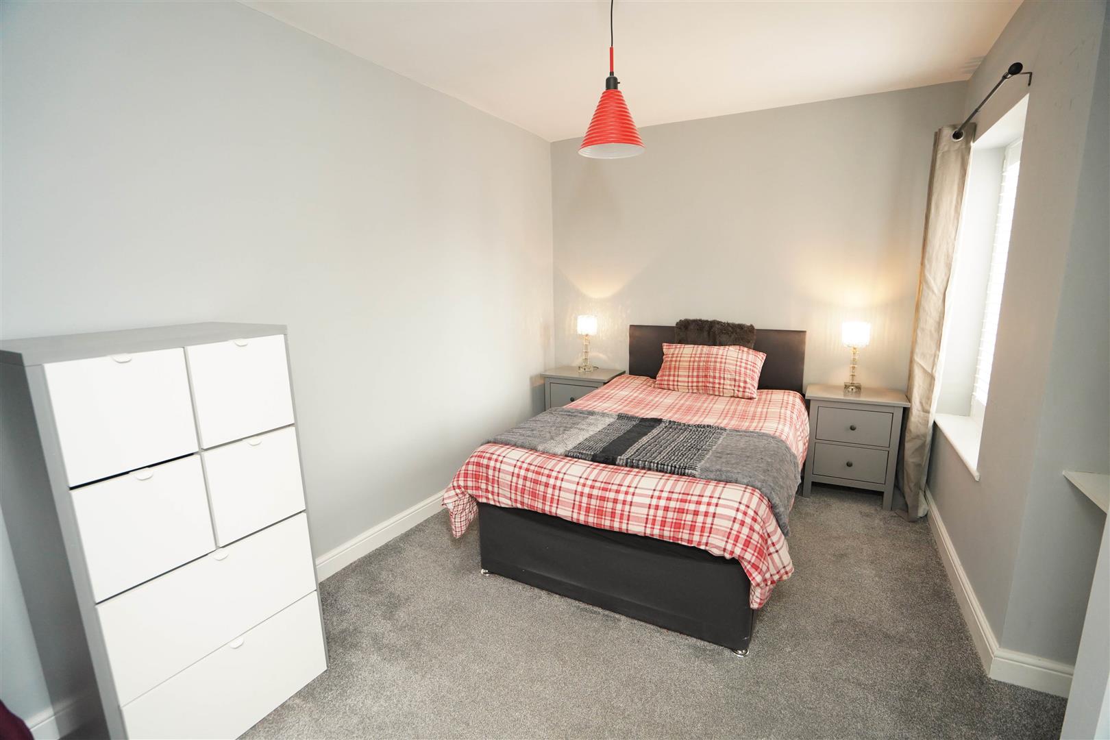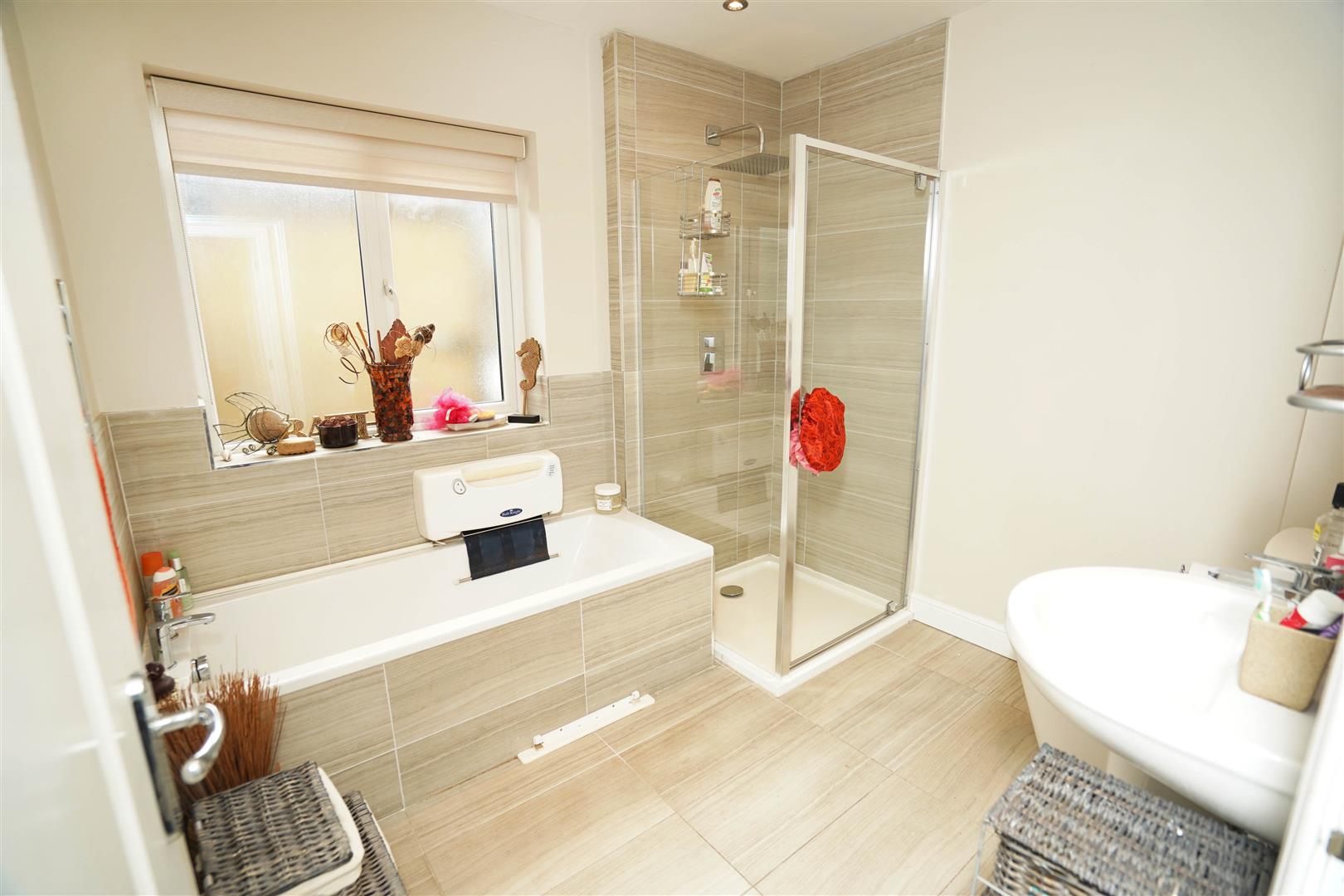 Fitted with four piece modern white suite with comprising, deep panelled bath with mixer tap, pedestal wash hand basin with matching and tiled splashback, tiled shower cubicle with rainfall shower over and low-level WC, half height ceramic tiling to three walls, heated towel rail, uPVC frosted double window to side, ceramic tiled flooring.
