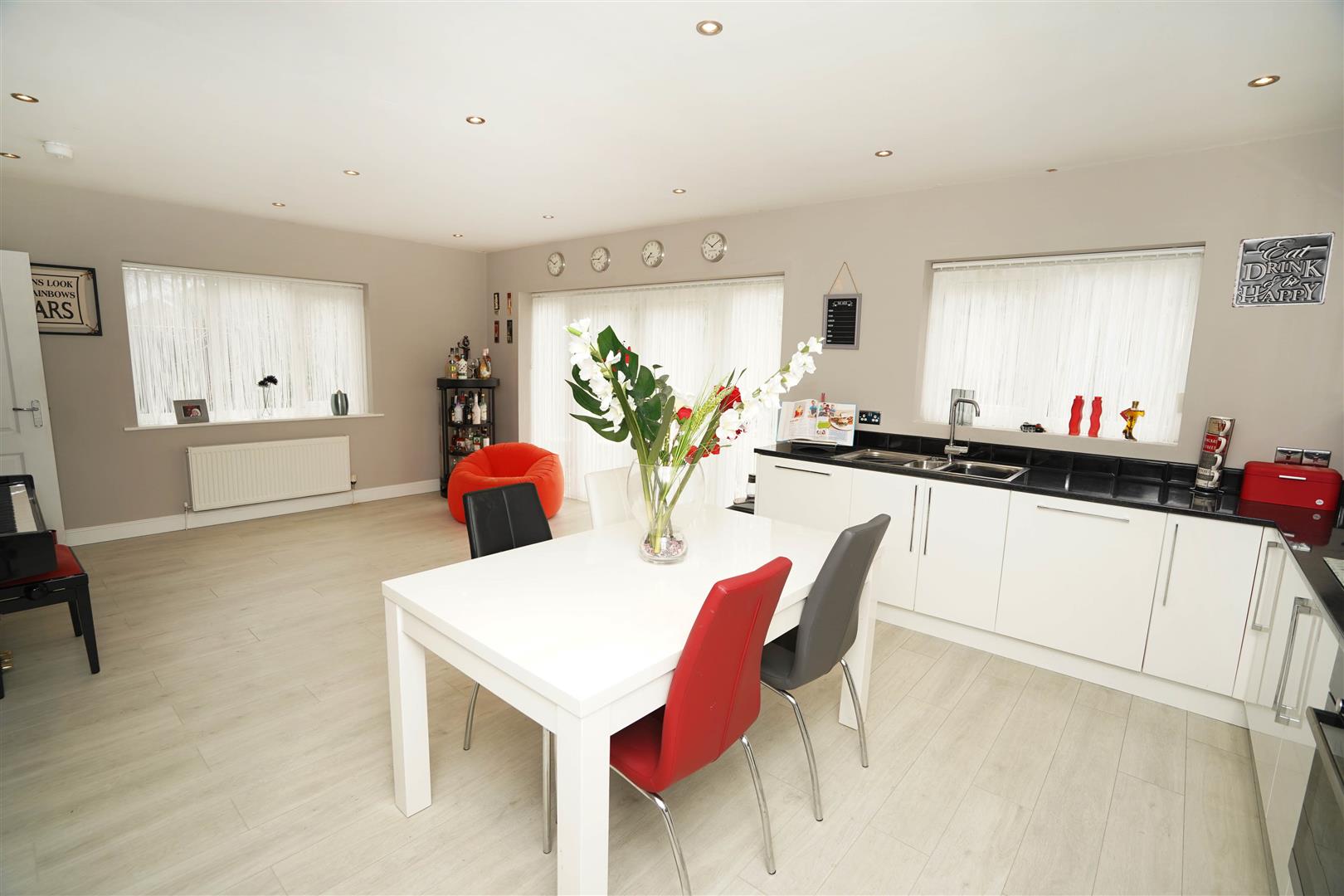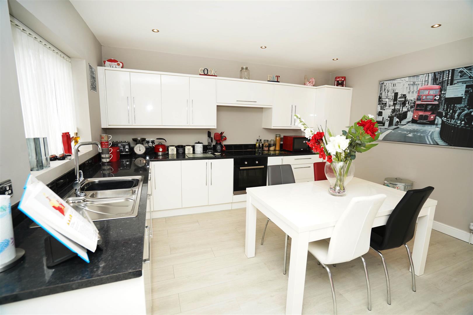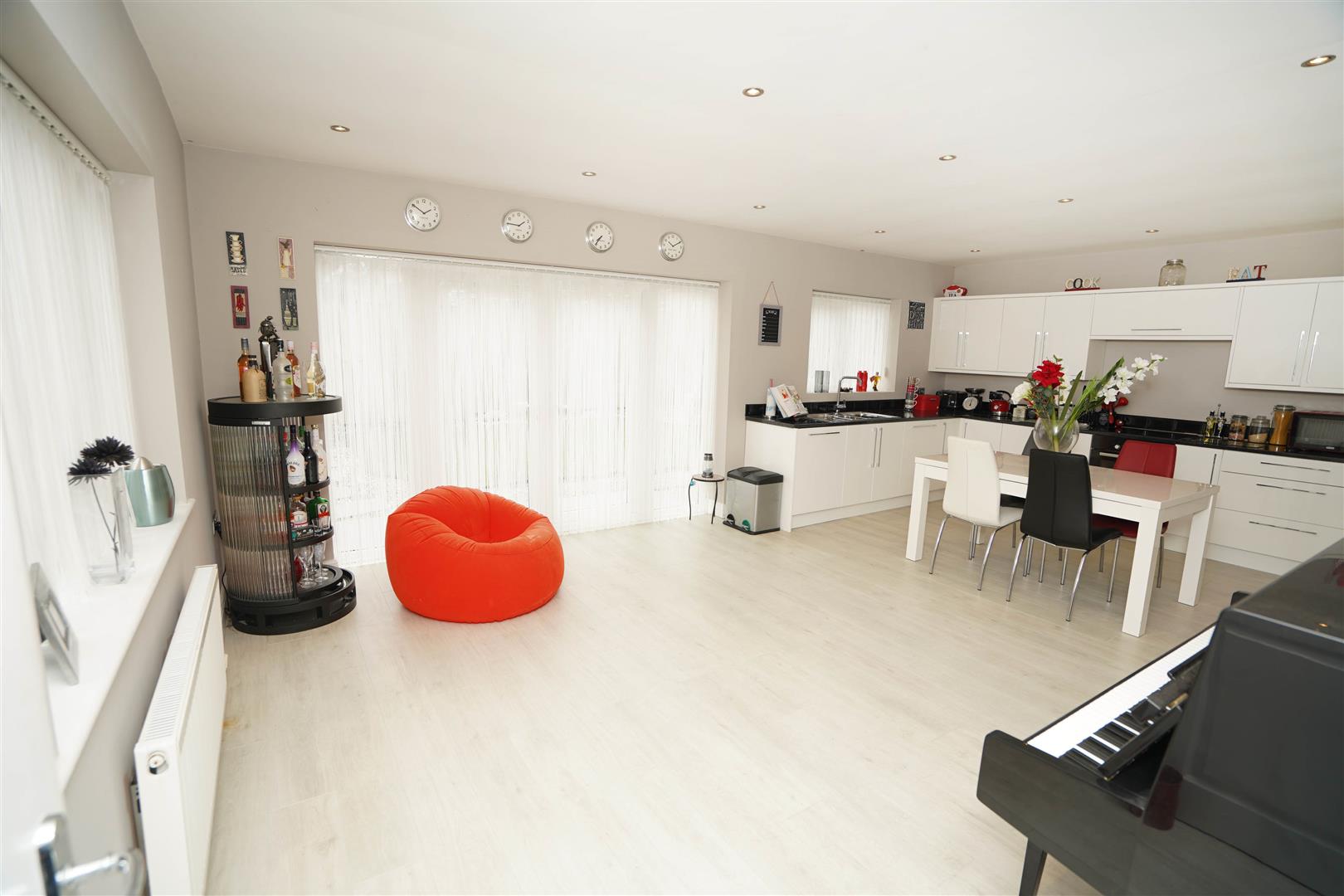 Fitted with a matching range of modern white gloss base and eye level units with drawers, cornice trims and contrasting round edged worktops, 1+1/2 bowl stainless steel sink unit with single drainer and mixer tap with tiled splashbacks, integrated fridge/freezer, dishwasher and washing machine, built-in electric fan assisted oven, four ring hob with extractor hood over, uPVC double glazed window to side, three uPVC double glazed windows to rear, two radiators, laminate flooring, ceiling with recessed spotlights, uPVC double glazed french doors to garden, door to: