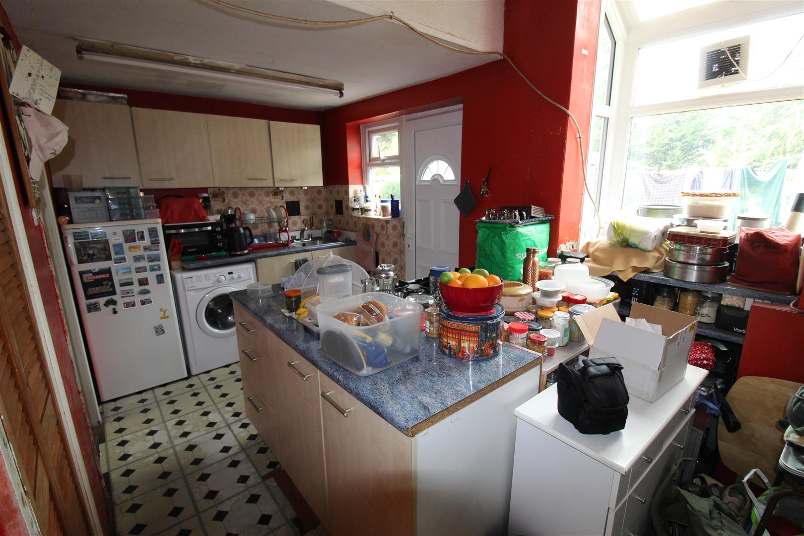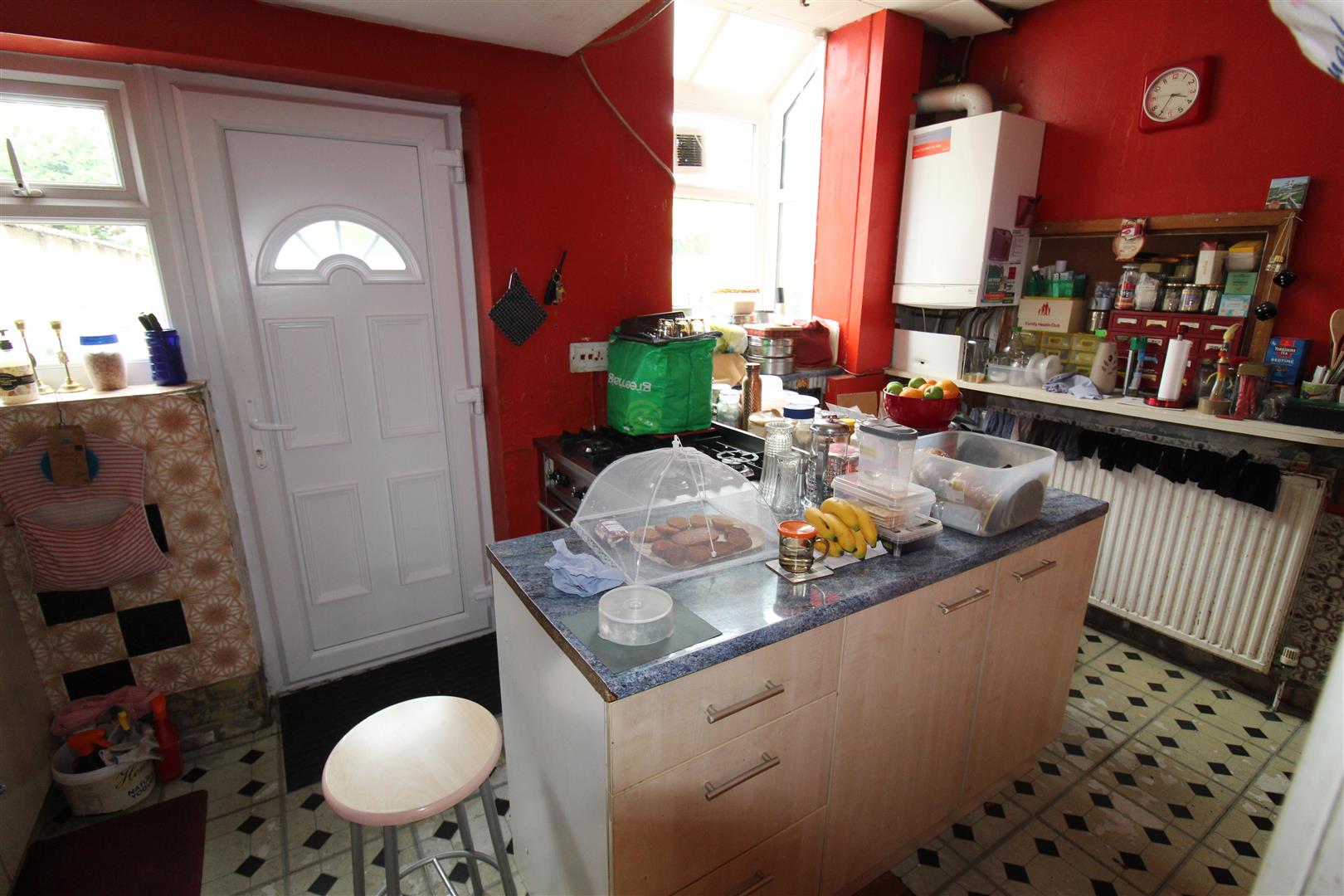 Range of base and eye level units with worktop space over with drawers, stainless steel sink unit with single drainer, plumbing for automatic washing machine, space for fridge/freezer, five ring gas hob, two uPVC double glazed windows to rear, radiator, open plan, door to: