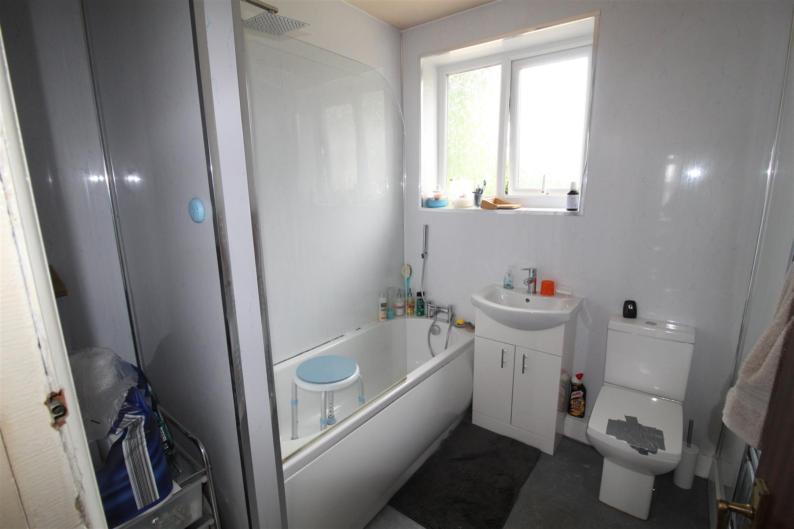 Three piece suite comprising deep panelled bath, vanity wash hand basin with storage under and mixer tap, shower with over and folding glass screen and low-level WC, uPVC frosted double glazed window to rear, heated towel rail.