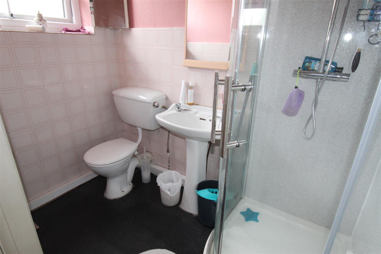Three piece suite comprising pedestal wash hand basin, shower cubicle with matching shower base and folding glass screen and low-level WC, tiled splashbacks, uPVC frosted double glazed window to rear, radiator.