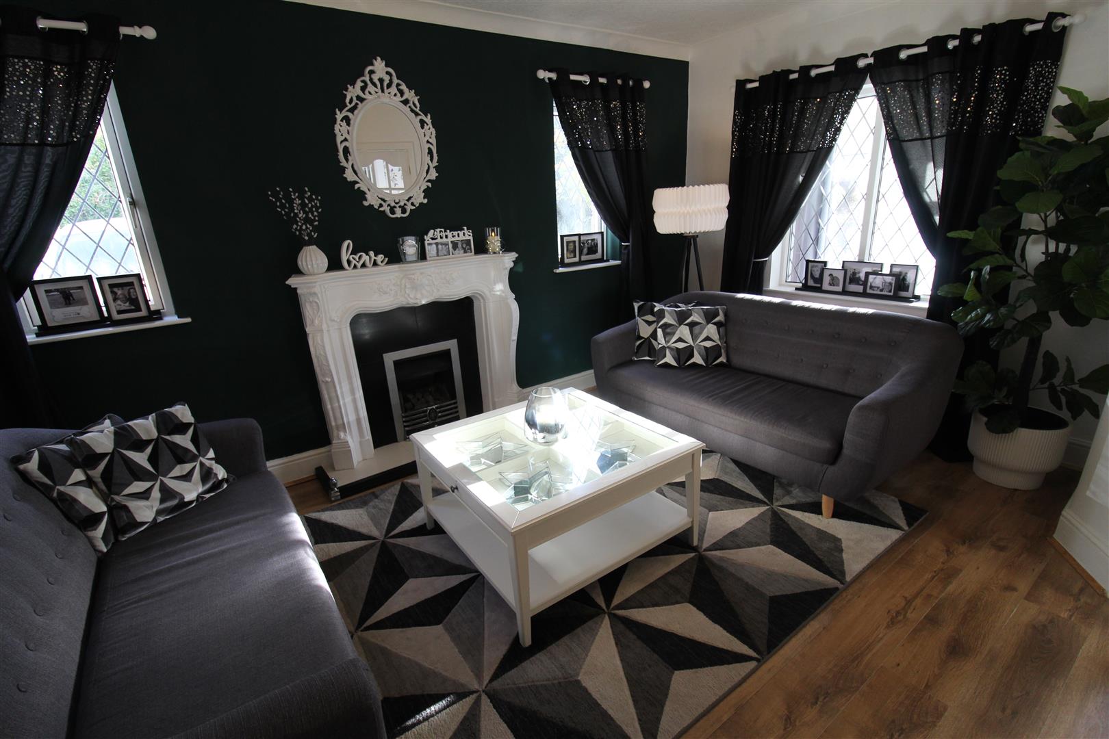 Two windows to side, coal effect gas fire set in feature surround, double radiator, electric radiator, door to: