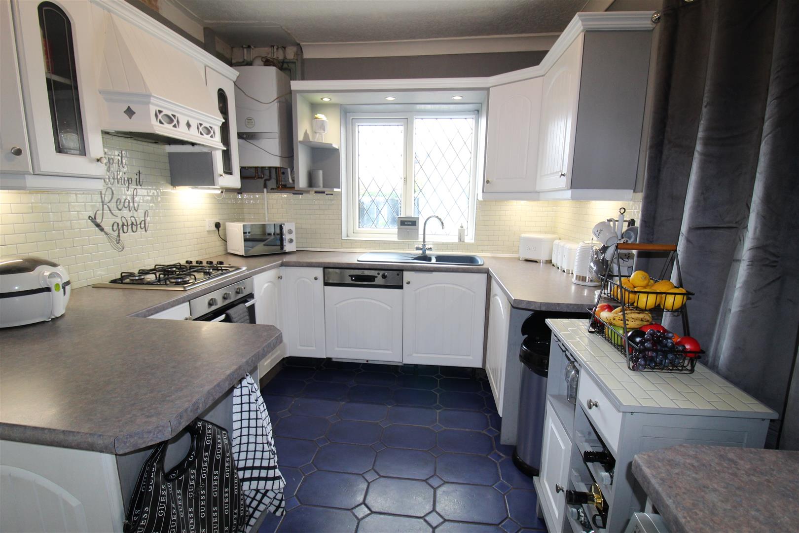 1+1/2 bowl polycarbonate sink unit with single drainer and mixer tap, built-in fridge/freezer and dishwasher, plumbing for automatic washing machine, built-in electric fan assisted oven, built-in four ring gas hob with extractor hood over, uPVC double glazed window to side, double radiator, hardwood glazed stable door to side, door to: