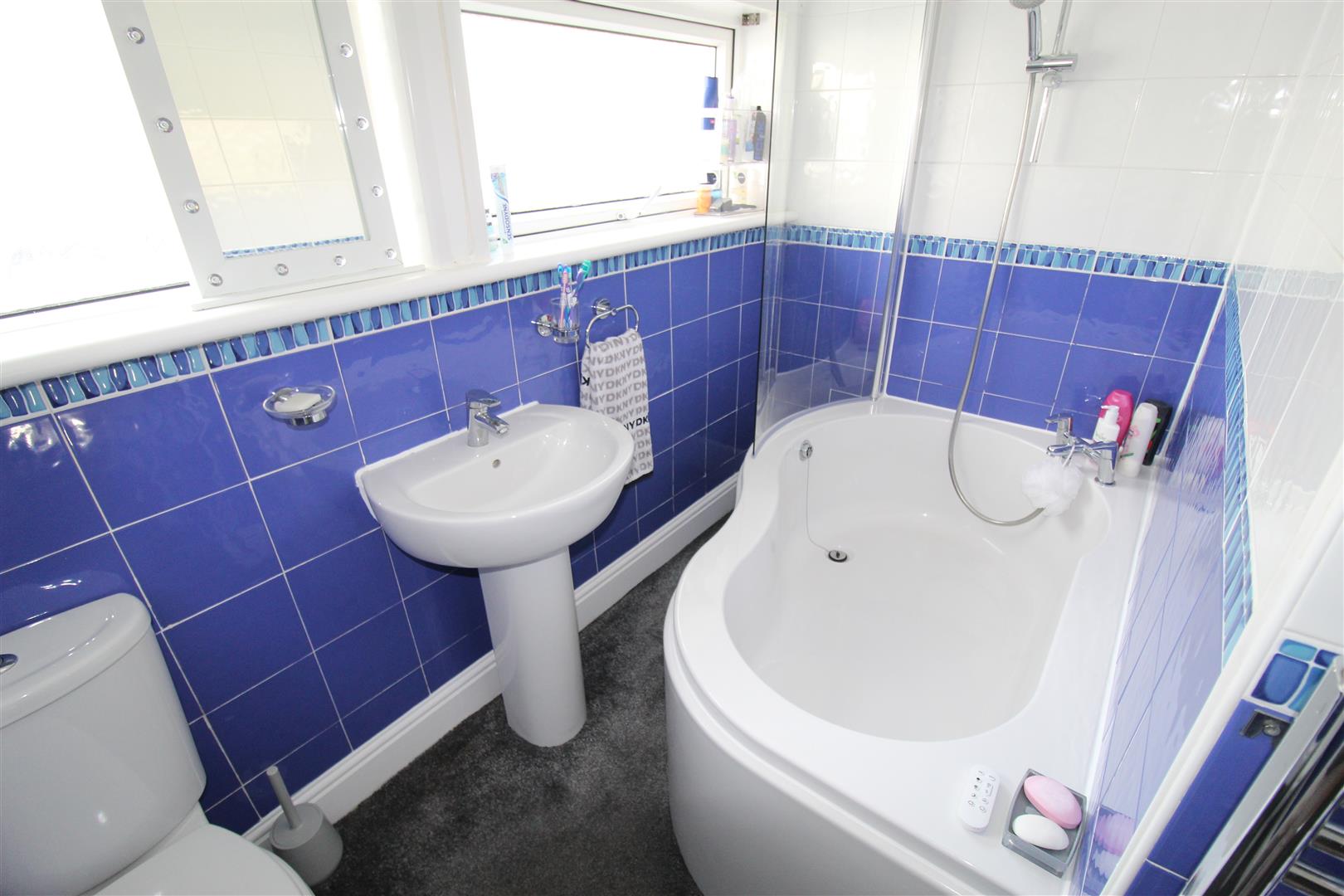 Three piece suite comprising deep panelled bath, pedestal wash hand basin, shower with over and folding glass screen and low-level WC, full height ceramic tiling to all walls, heated towel rail, uPVC double glazed window to rear, uPVC frosted double glazed window to rear, heated towel rail, door to: