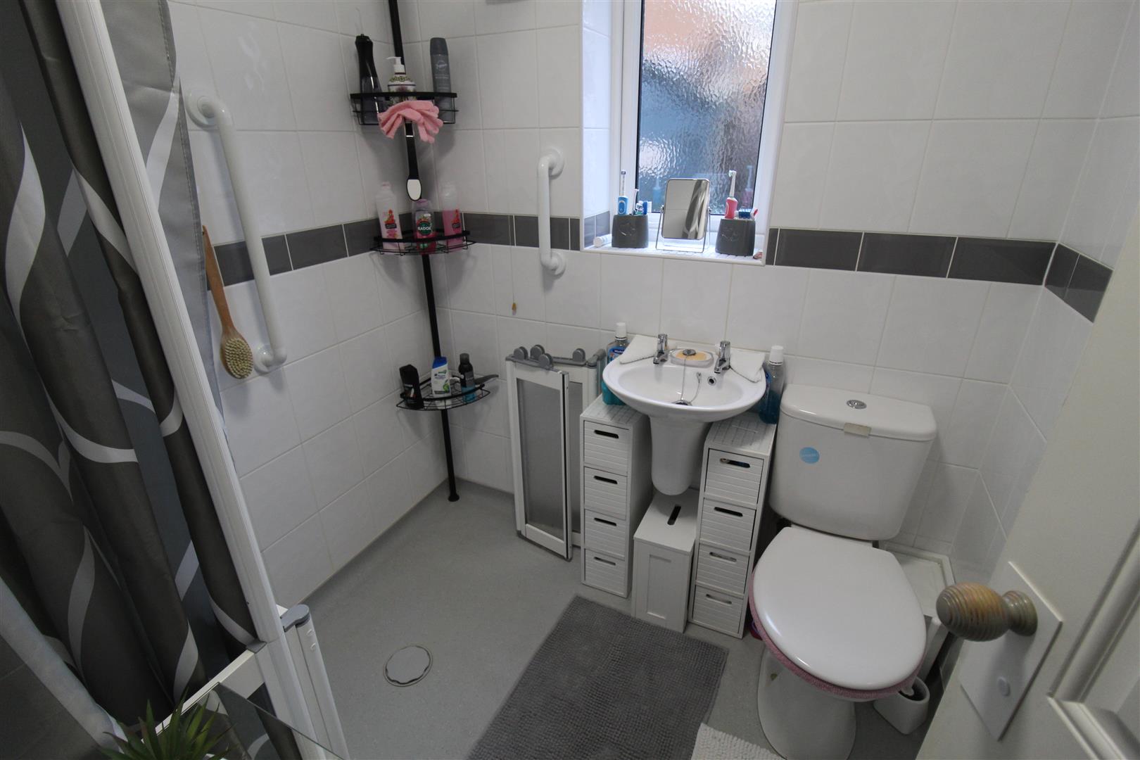 Wet room with wash hand basin with ceramic and tiling to all walls, shower area and low-level WC, uPVC frosted double glazed window to side, heated towel rail.
