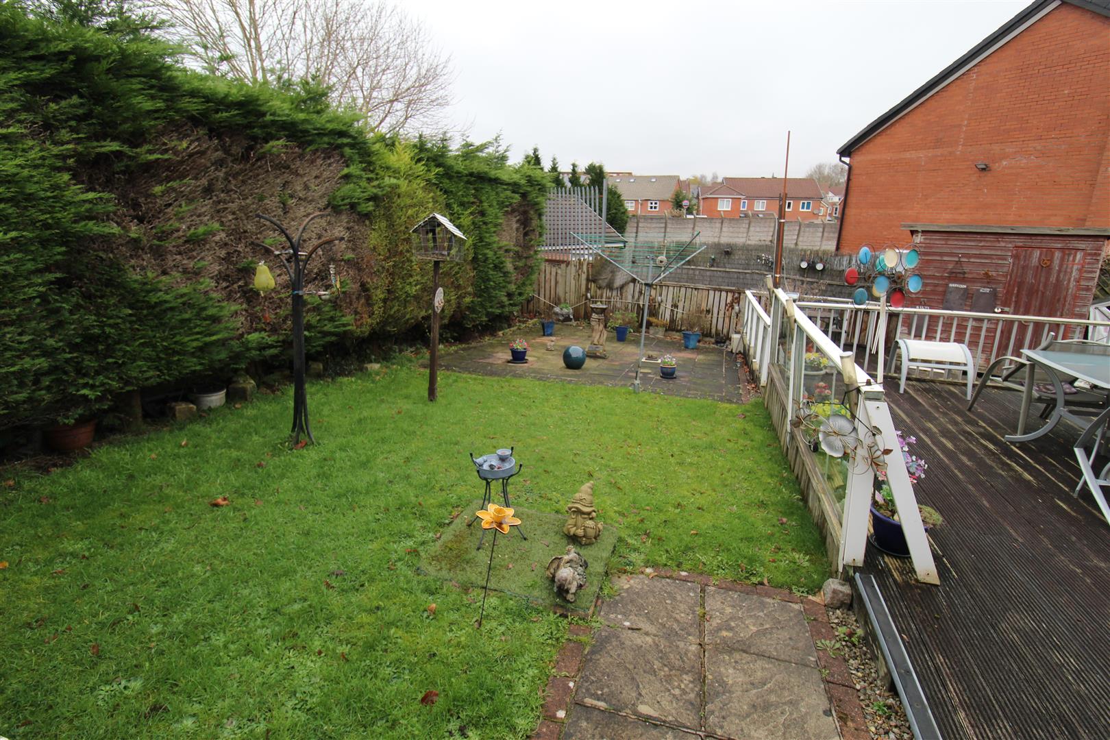 Enclosed rear garden with decked area seating area with garden sheds lawned area with mature planting.