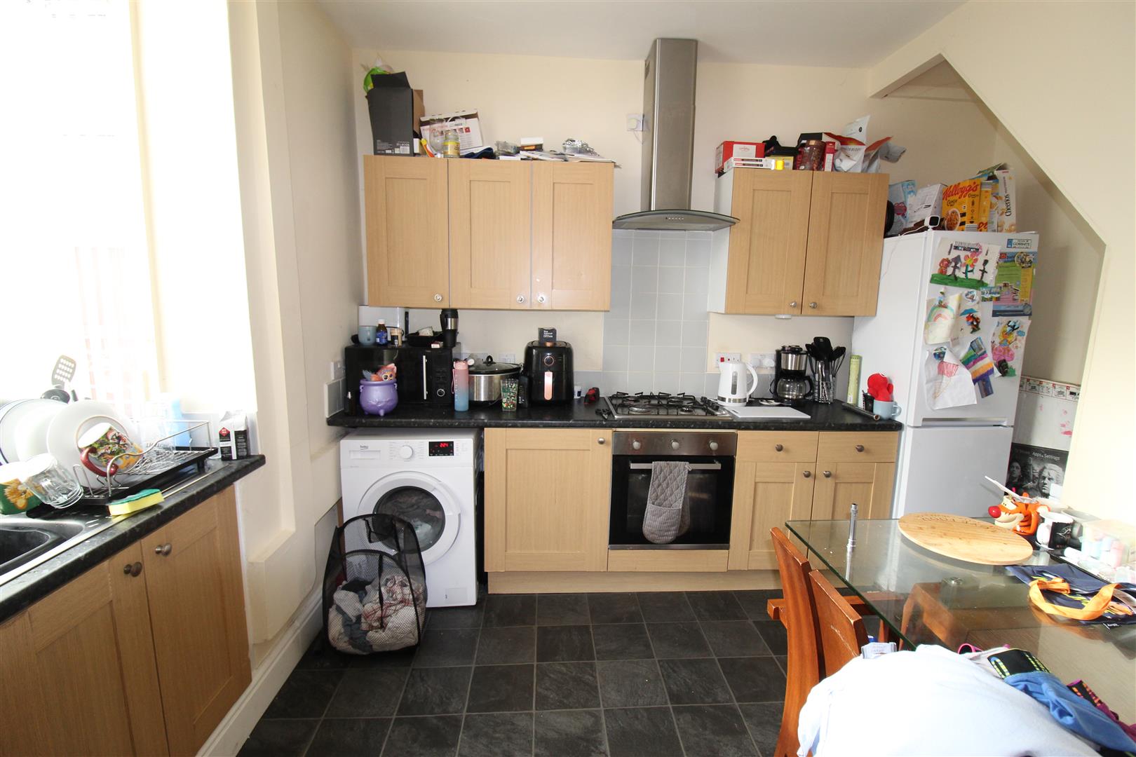 Fitted with a matching range of base and eye level units with worktop space over with underlighting, drawers and round edged worktops, stainless steel sink unit, plumbing for automatic washing machine, space for fridge/freezer, built-in electric fan assisted oven, built-in four ring gas hob with extractor hood over, uPVC double glazed box window to rear, radiator, stairs, uPVC double glazed entrance door to rear, door to:
