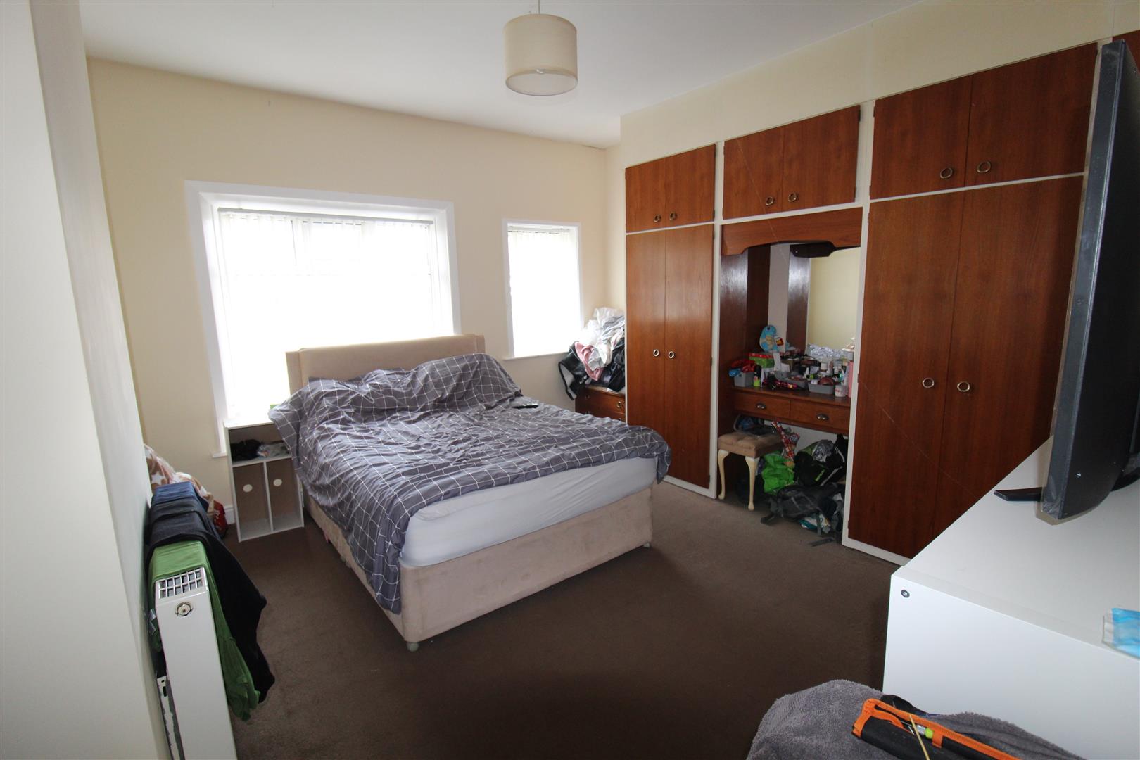 Two uPVC double glazed windows to front, Storage cupboard, fitted with a range of wardrobes with hanging rail, shelving, overhead storage and drawers, double radiator, two double doors, door to: