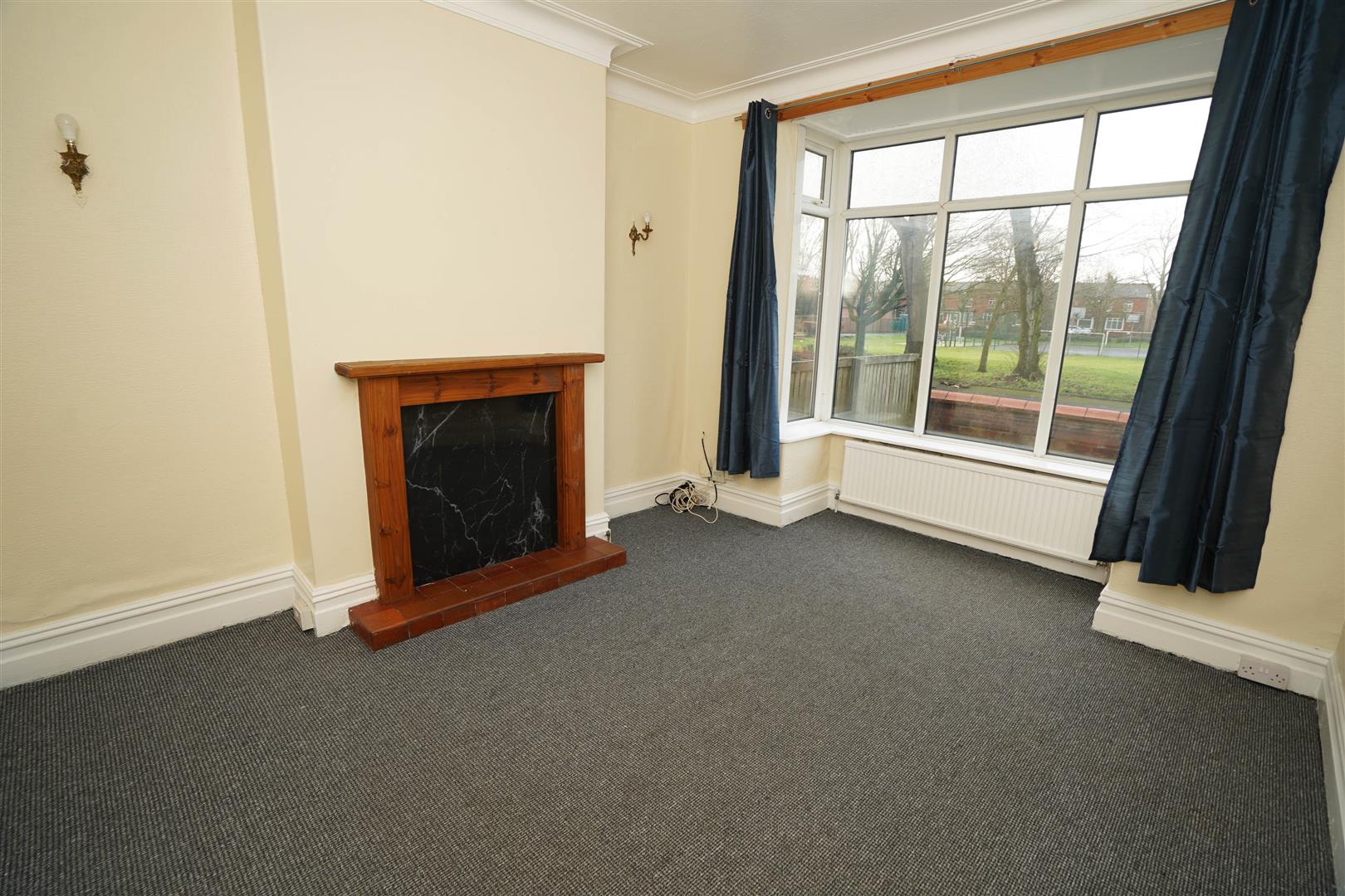 UPVC double glazed box window to front with views over the park, fireplace with timber surround, radiator, two wall lights, coving to ceiling.