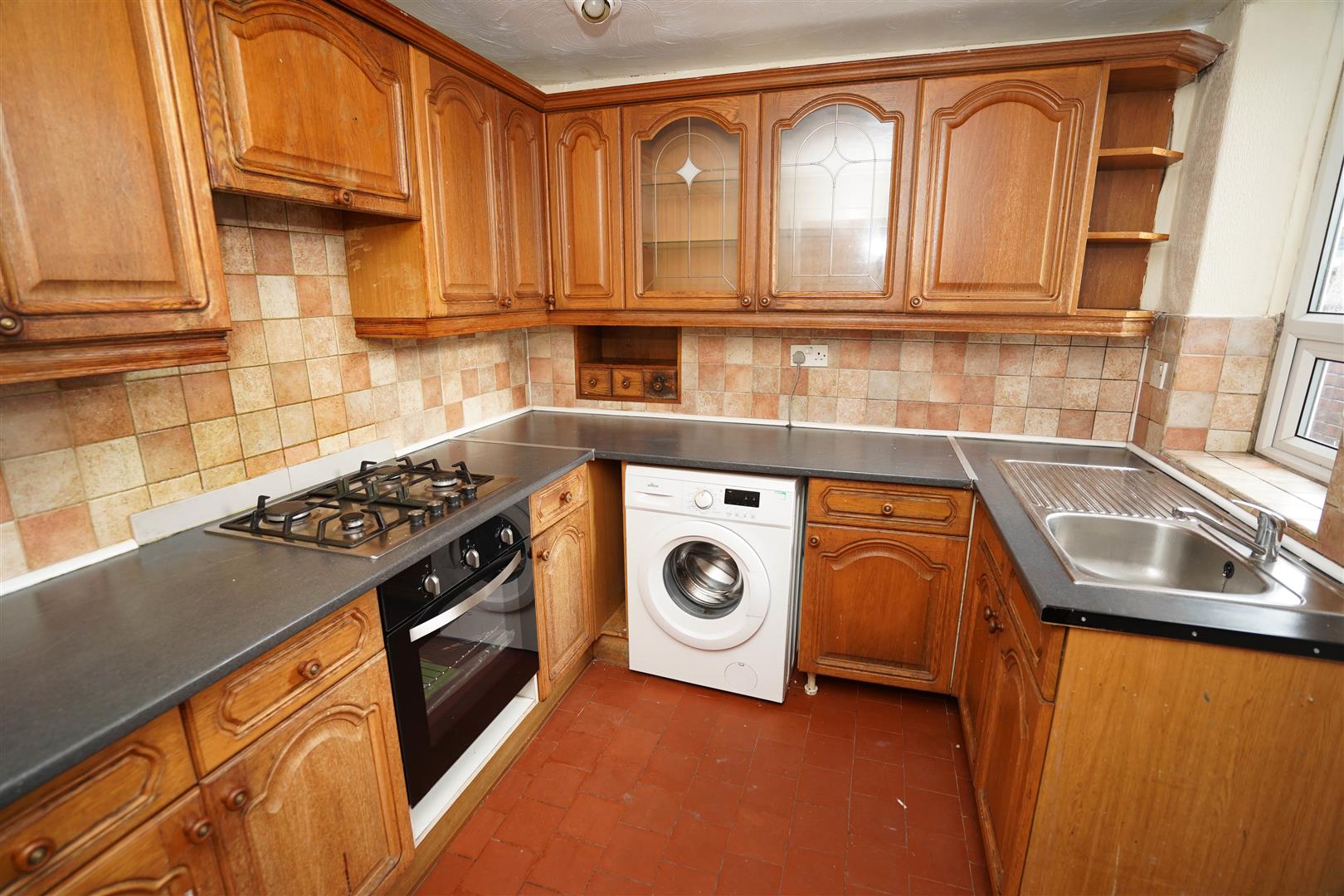 Base and eye level cupboards with contrasting round edged worktops, stainless steel sink with single drainer and mixer tap with tiled splashbacks, plumbing for washing machine, space for fridge/freezer, built-in electric fan assisted oven, four ring gas hob with pull out extractor hood over, uPVC double glazed window to side, quarry tiled flooring, door.