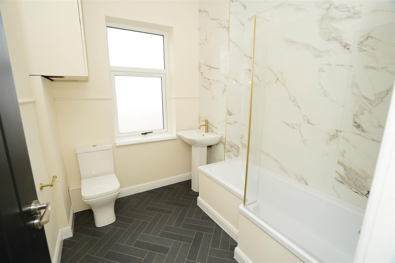 Fitted with three piece modern white suite with comprising, deep panelled bath with shower over and folding glass screen, pedestal wash hand basin with mixer tap and low-level WC, full height ceramic tiling to three walls, heated towel rail, uPVC frosted double glazed window to rear, vinyl flooring.