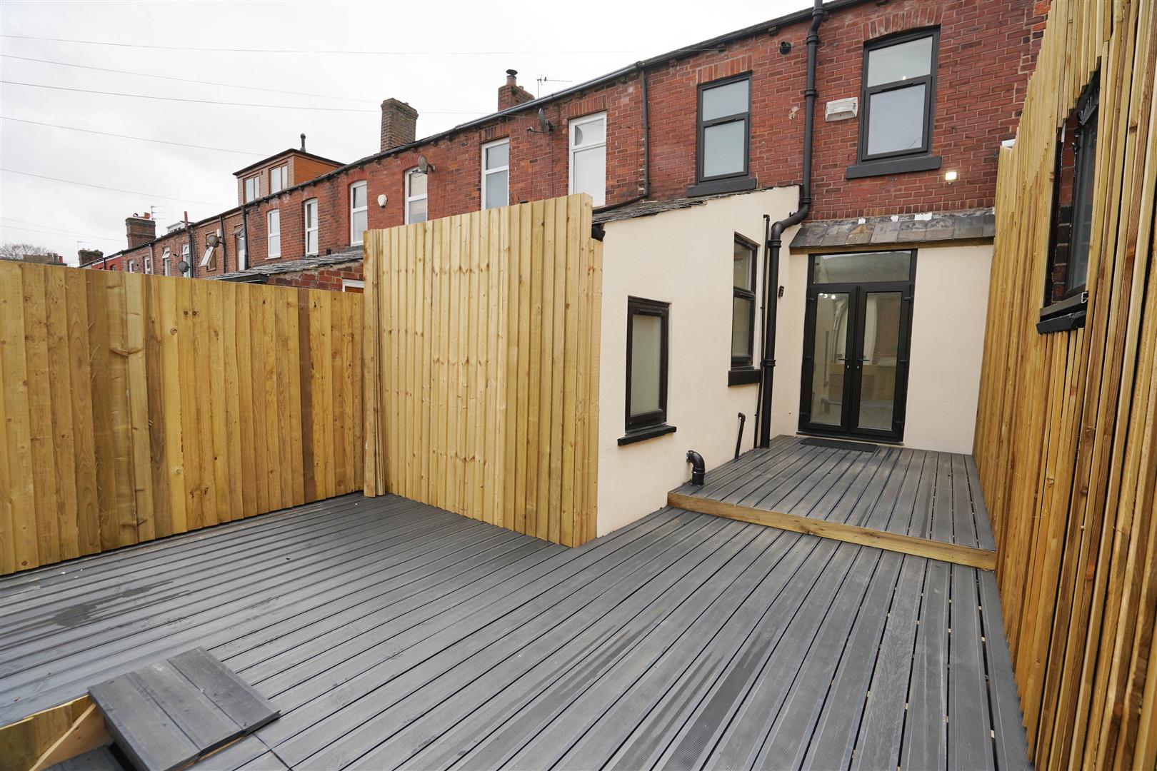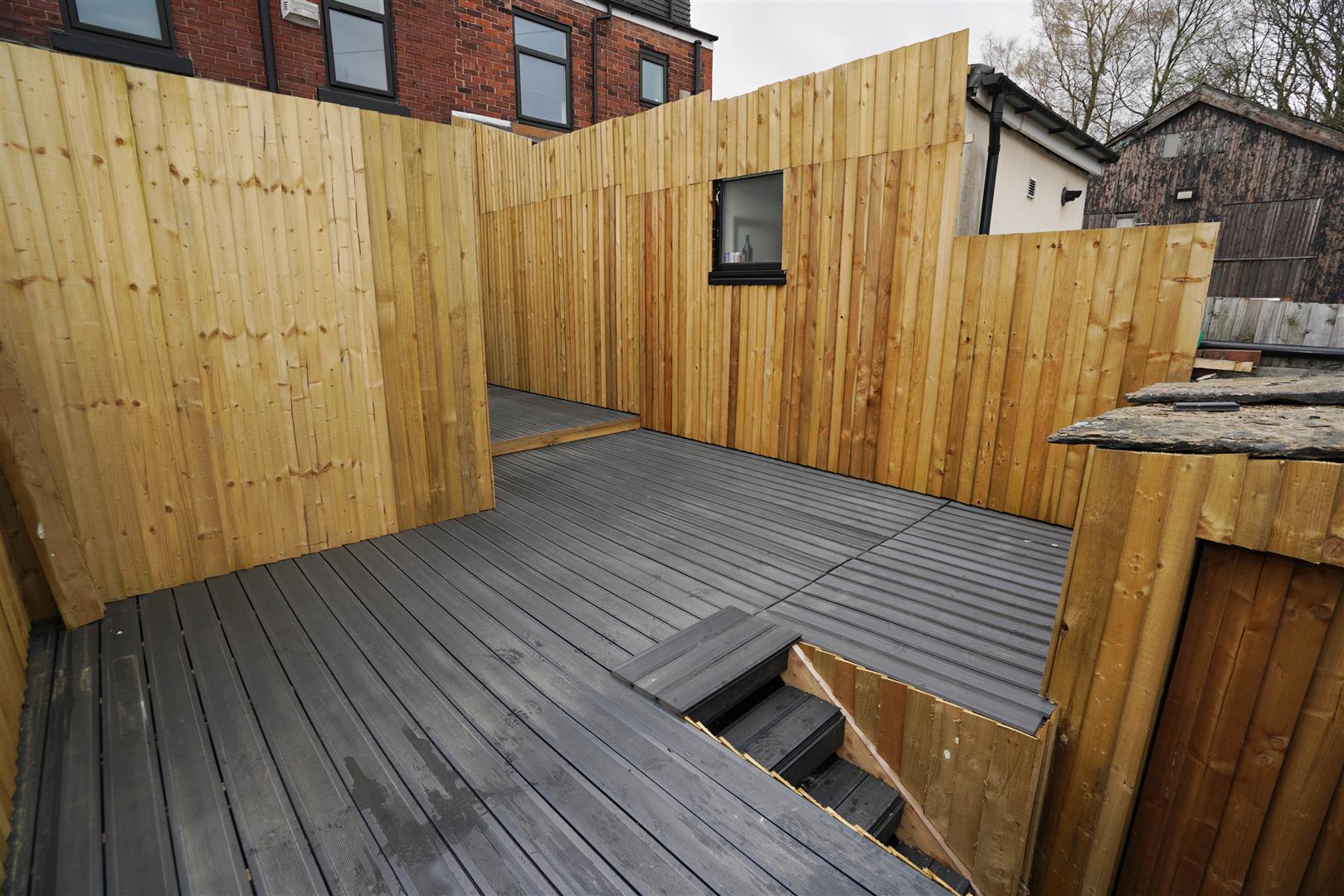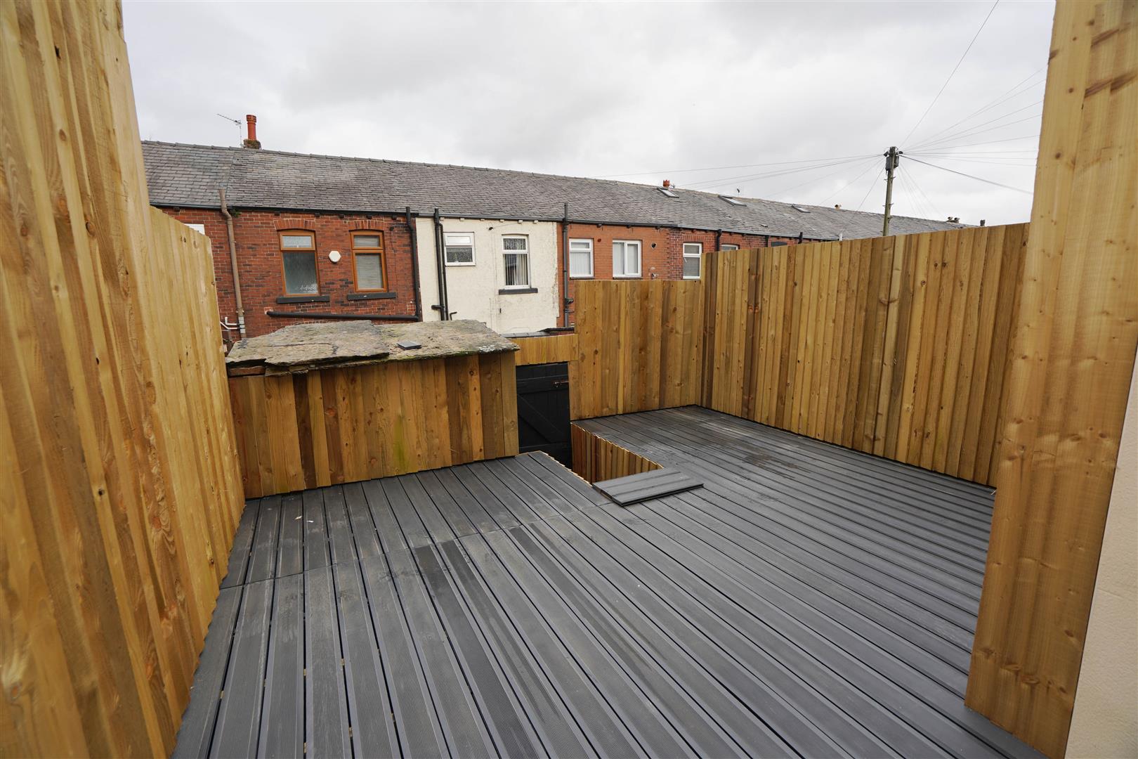 Rear enclosed by timber fencing to rear and sides large composite decking area, brick built shed and rear gated access.