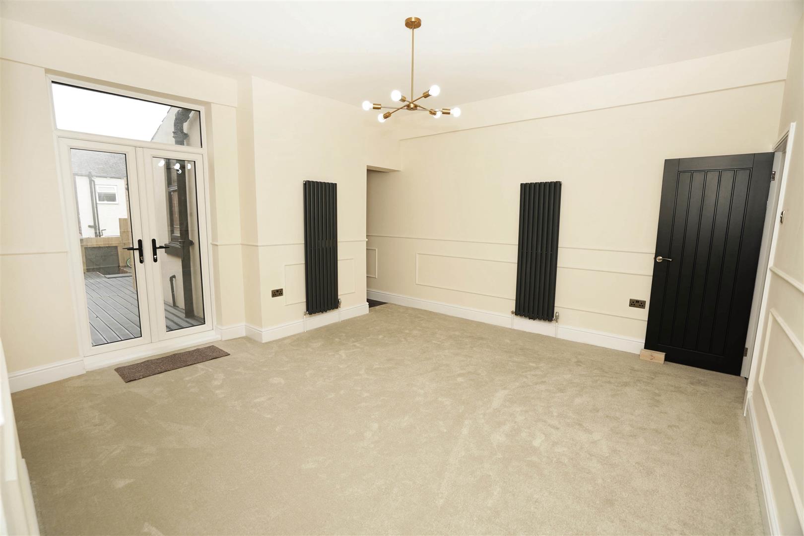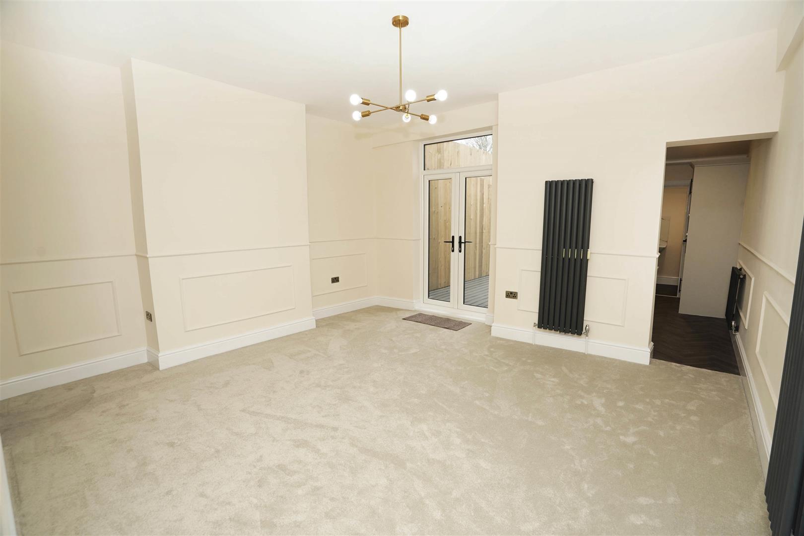 Two vertical radiators, door to built-in under-stairs storage cupboard, uPVC double glazed French doors to rear, open plan to: