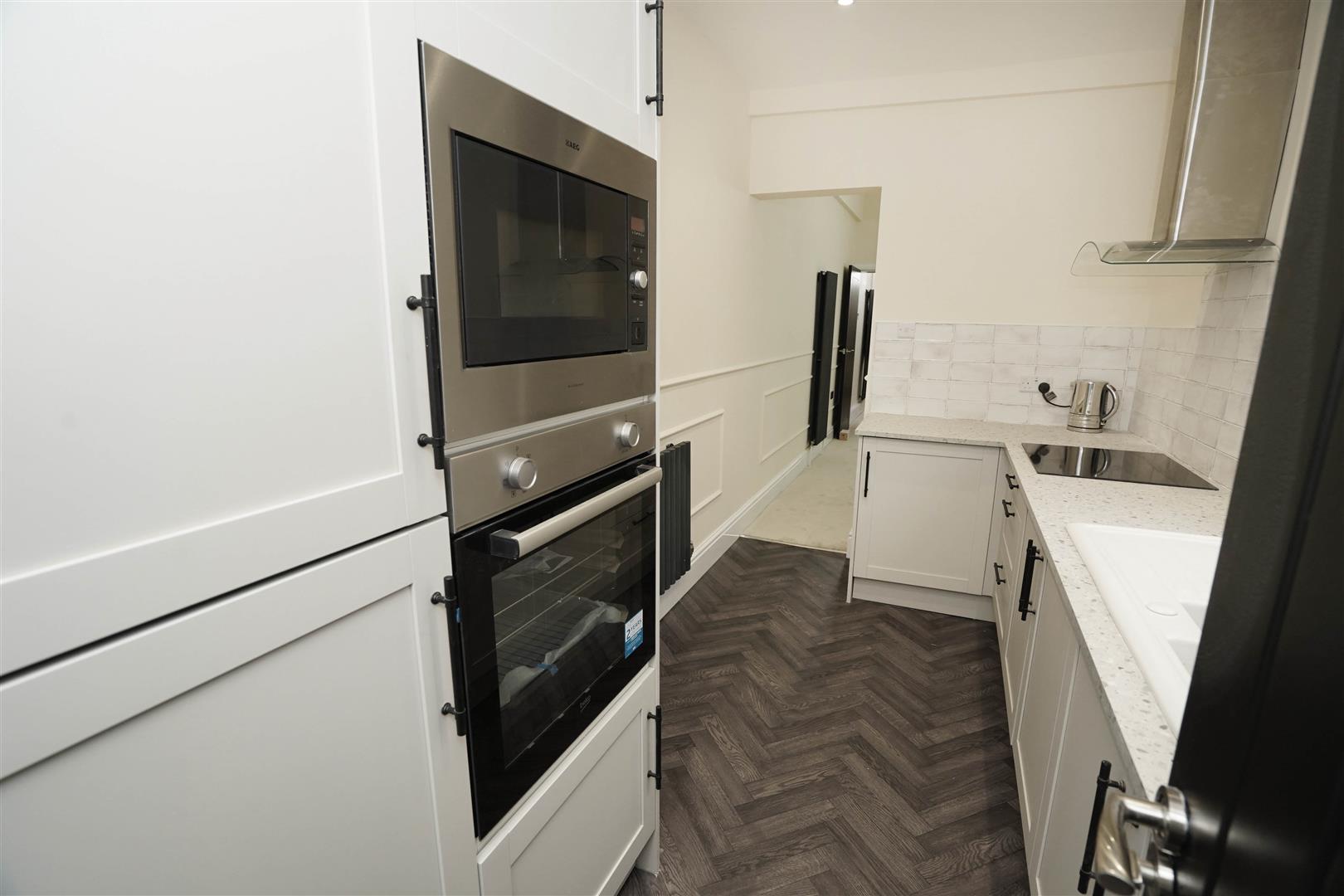 Fitted with a matching range of pale grey base and eye level units, 1+1/2 bowl china sink unit with single drainer and swan neck mixer tap, built-in eye level electric fan assisted oven, induction hob with extractor hood over, built-in microwave, radiator, built-in eye level electric fan assisted oven, hob with extractor hood over, built-in microwave, vinyl flooring, door to: