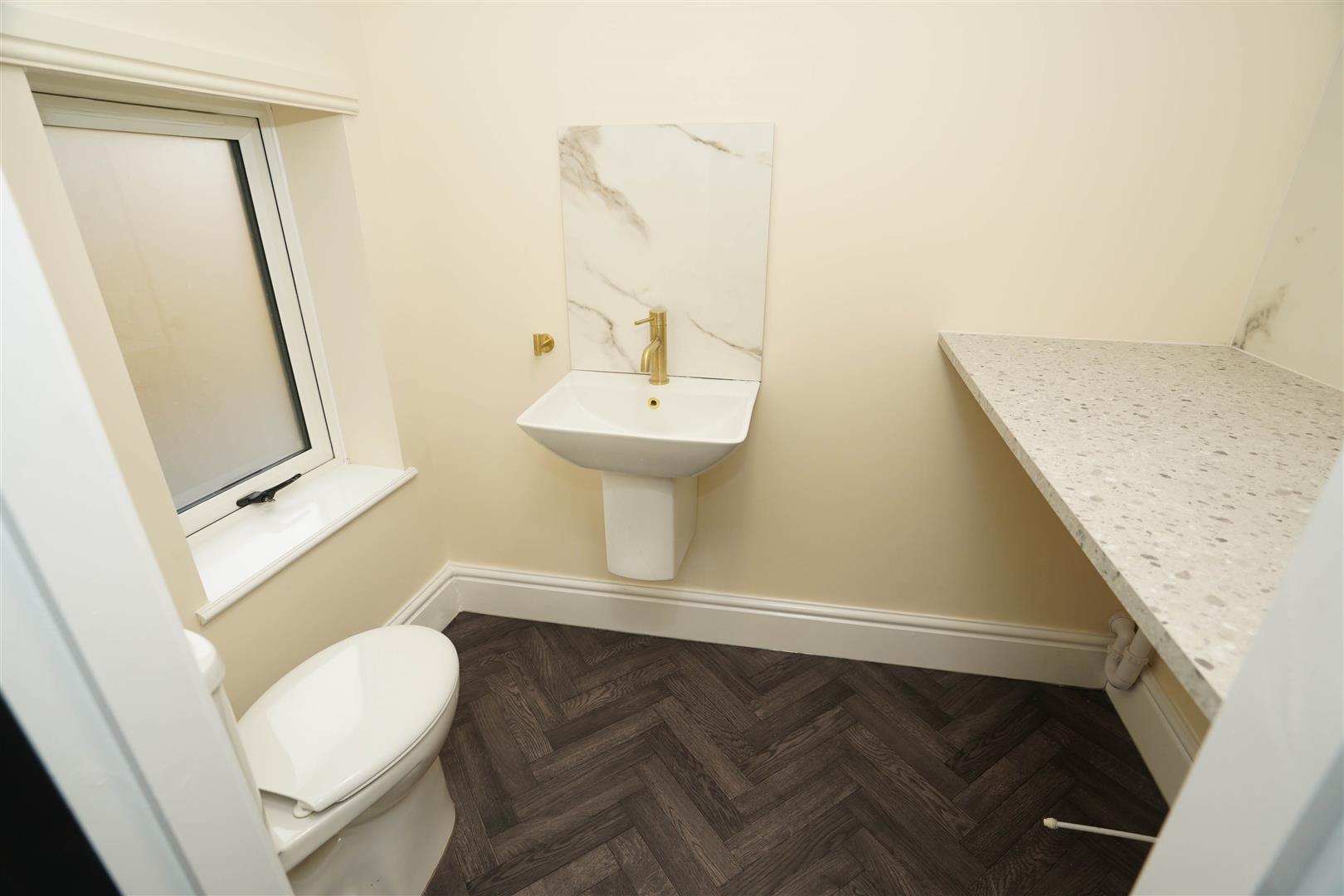UPVC double glazed window to side, fitted with two piece suite comprising, wall mounted wash hand basin with mixer tap and tiled splashback and low-level WC, plumbing for washing machine worktop space space for tumble dryer.
