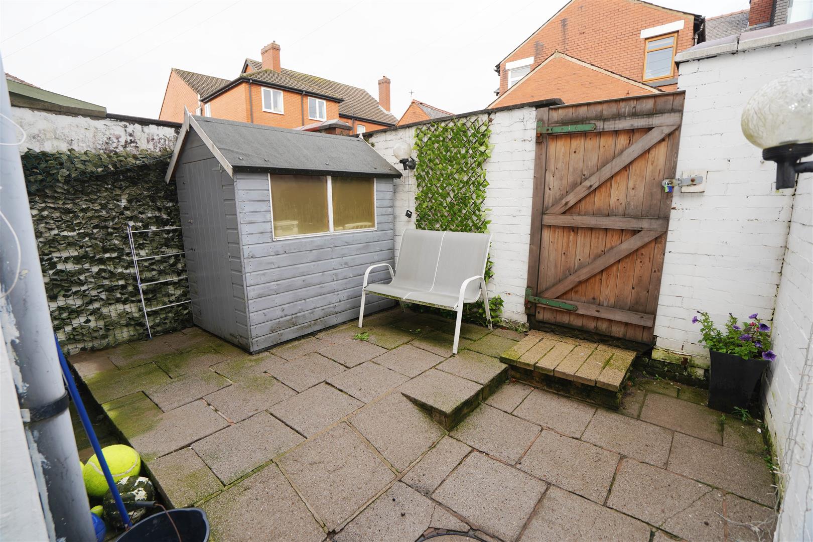 Rear garden, enclosed by brick wall rear and sides, paved sun patio, rear gated access.