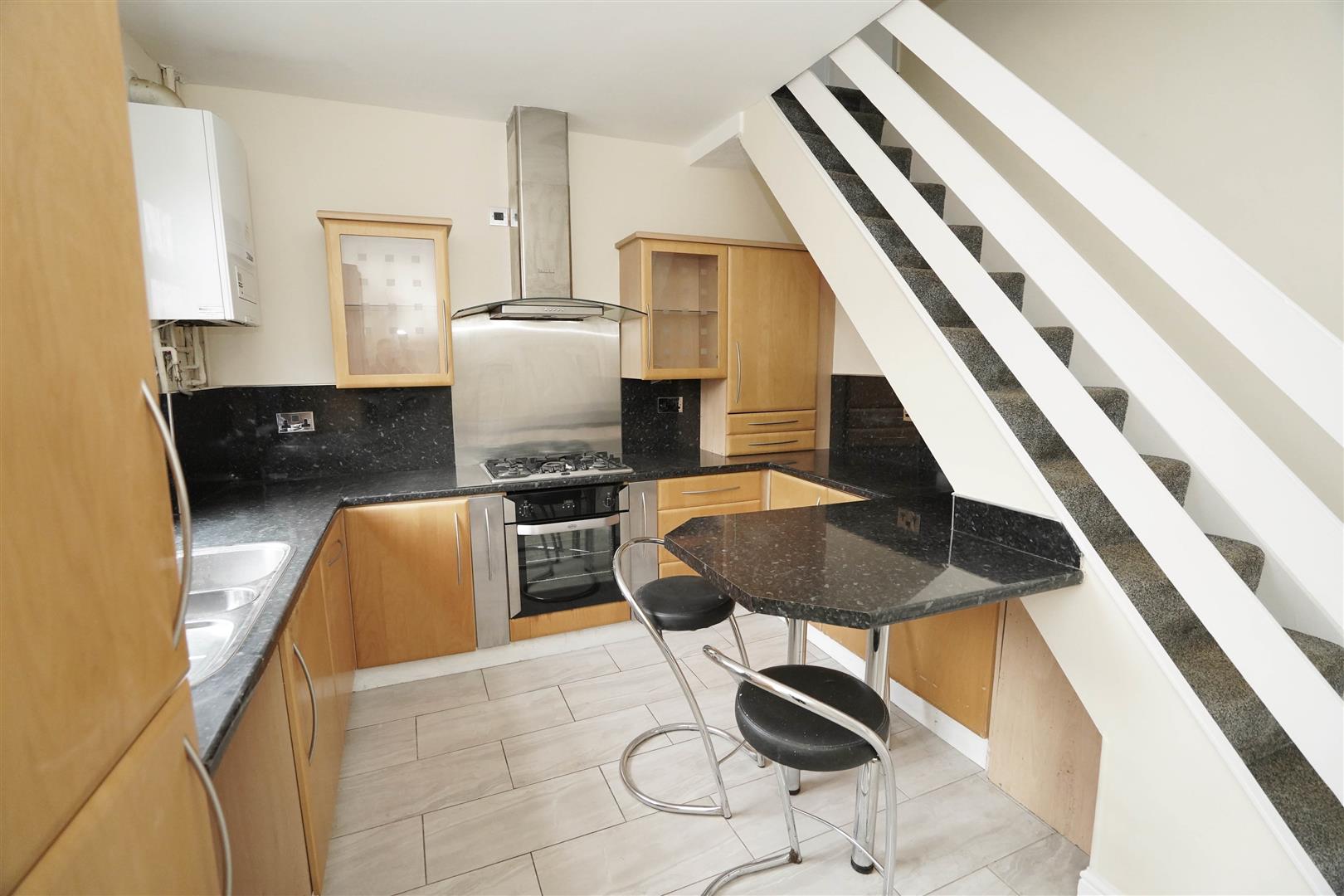 Fitted with a matching range of beech effect base and eye level units with drawers, cornice trims and contrasting round edged worktops, matching breakfast bar, 1+1/2 bowl stainless steel sink unit with single drainer and mixer tap, integrated dishwasher, plumbing for washing machine, integrated fridge/freezer, built-in electric fan assisted oven, five ring gas hob with extractor hood over, uPVC double glazed window to rear, radiator, wall mounted gas boiler serving heating system and domestic hot water, carpeted stairs to first floor landing, uPVC double glazed door to garden.