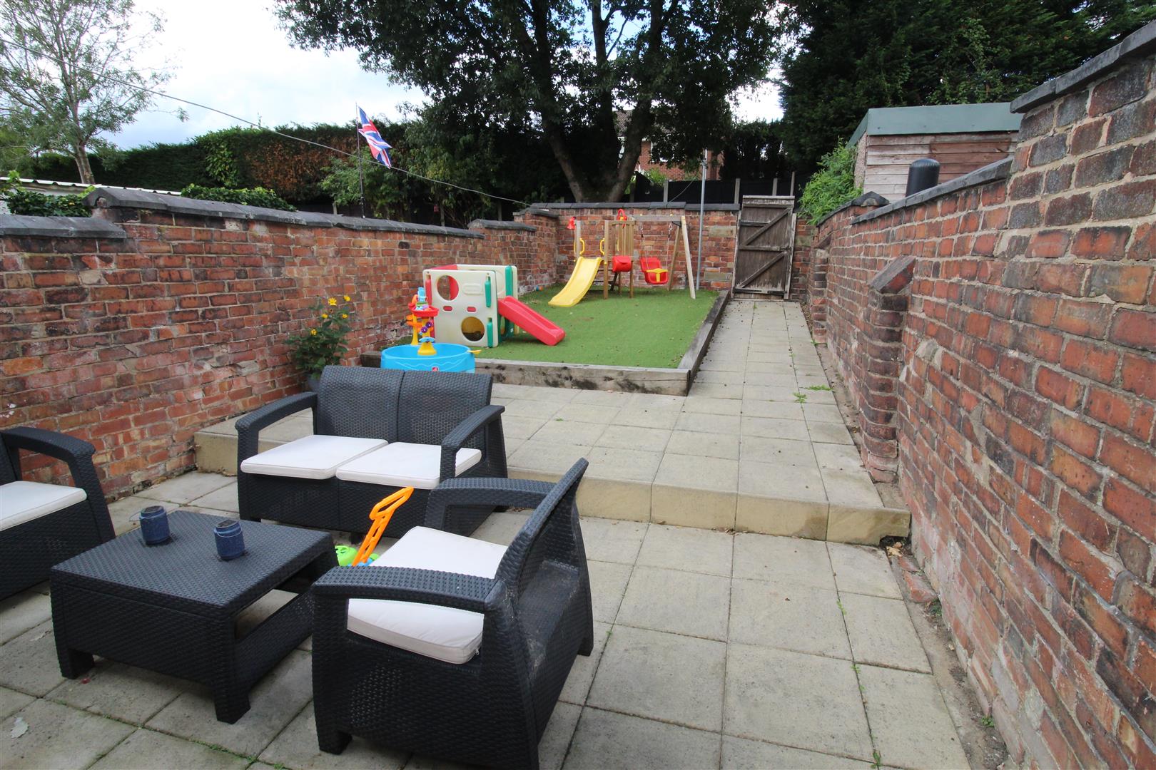 Fully enclosed garden laid to artificial lawn with mature planting Entrance gate to rear.