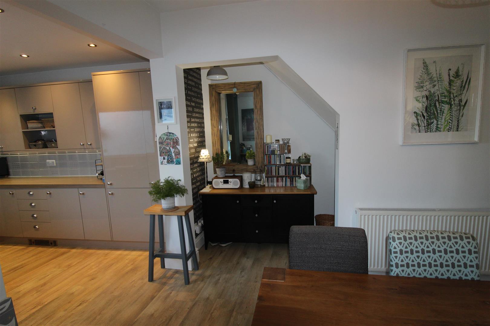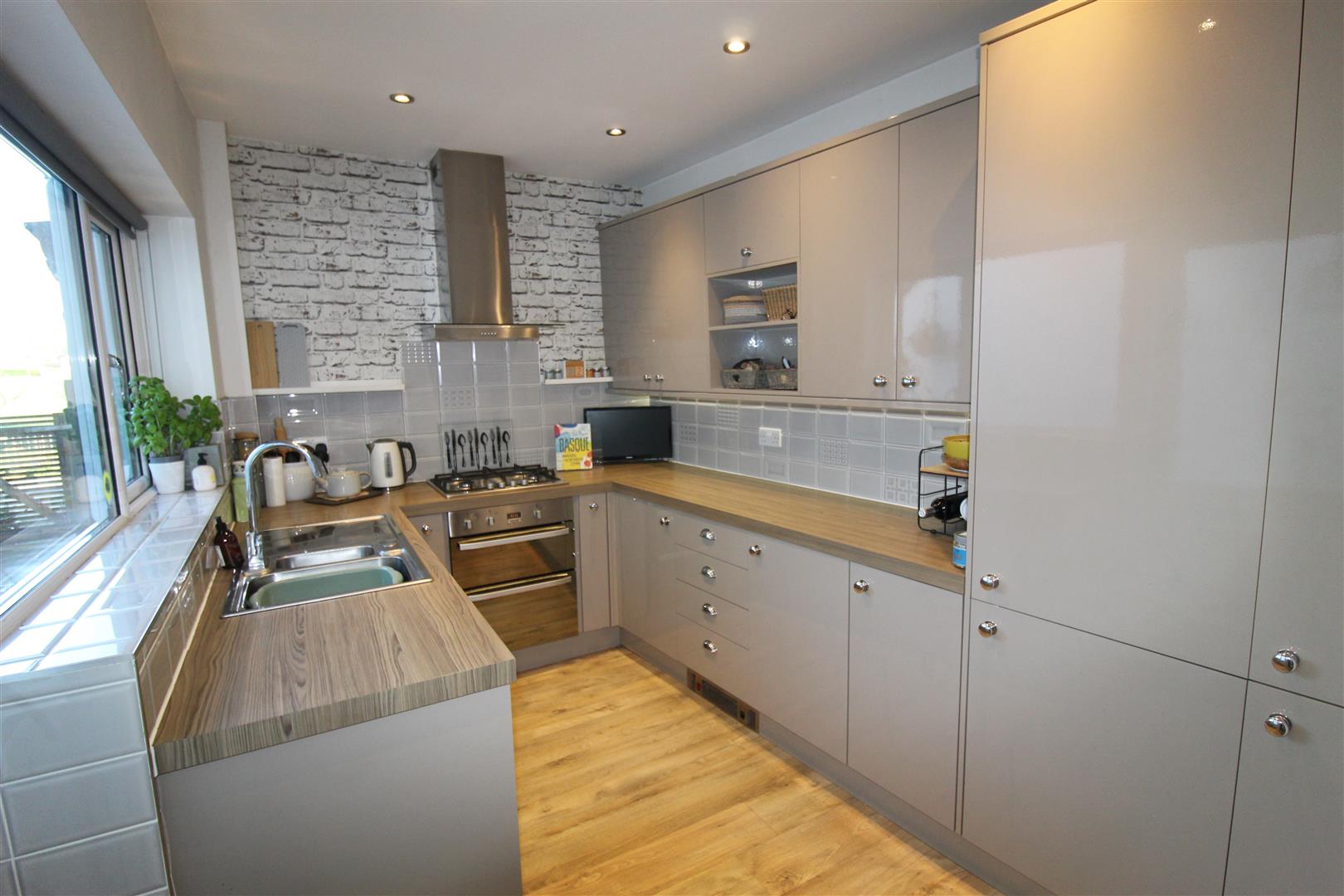 Fitted with a matching range of base and eye level units with worktop space over with underlighting, drawers and cornice trims, 1+1/2 bowl stainless steel sink unit with single drainer and mixer tap, built-in fridge/freezer and dishwasher, built-in electric fan assisted oven, built-in four ring gas hob with extractor hood over, uPVC double glazed window to side, uPVC double glazed entrance door to side, door to: