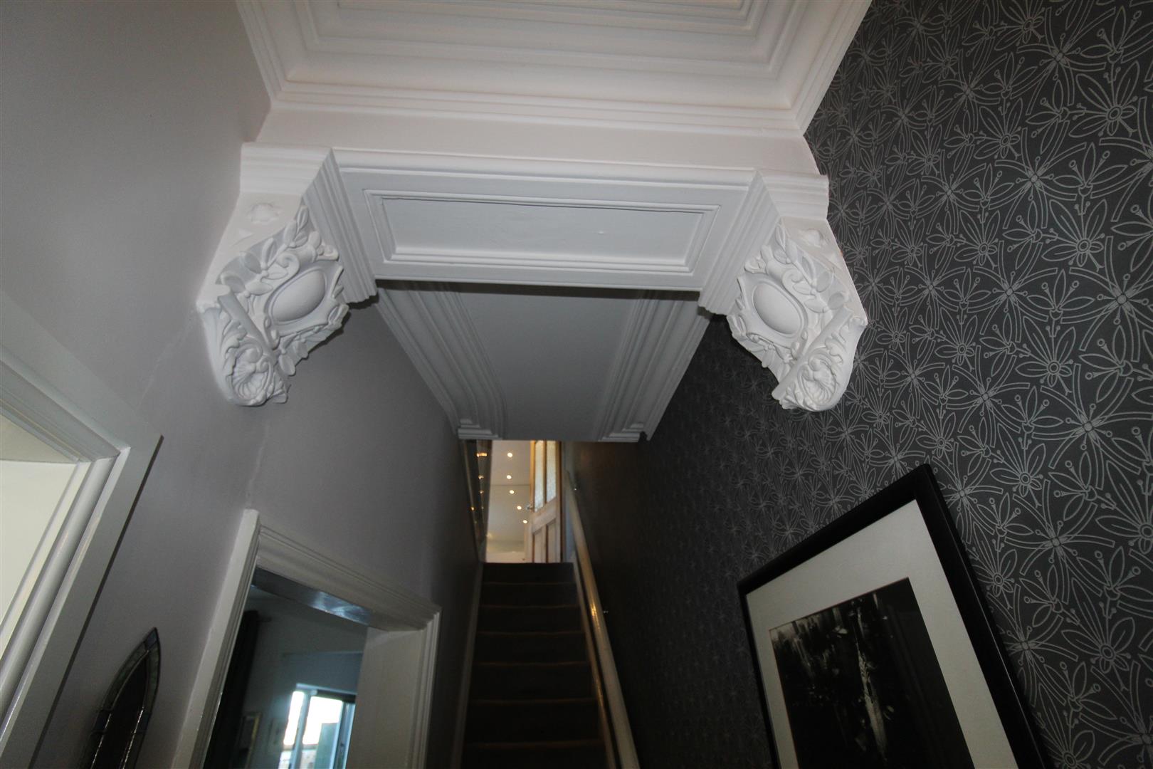 Four piece suite comprising deep panelled bath with mixer tap, pedestal wash hand basin with extensive ceramic tiling, shower enclosure with glass screen and mixer tap and low-level WC, wall mounted mirror, uPVC frosted double glazed window to side, heated towel rail, door to:
