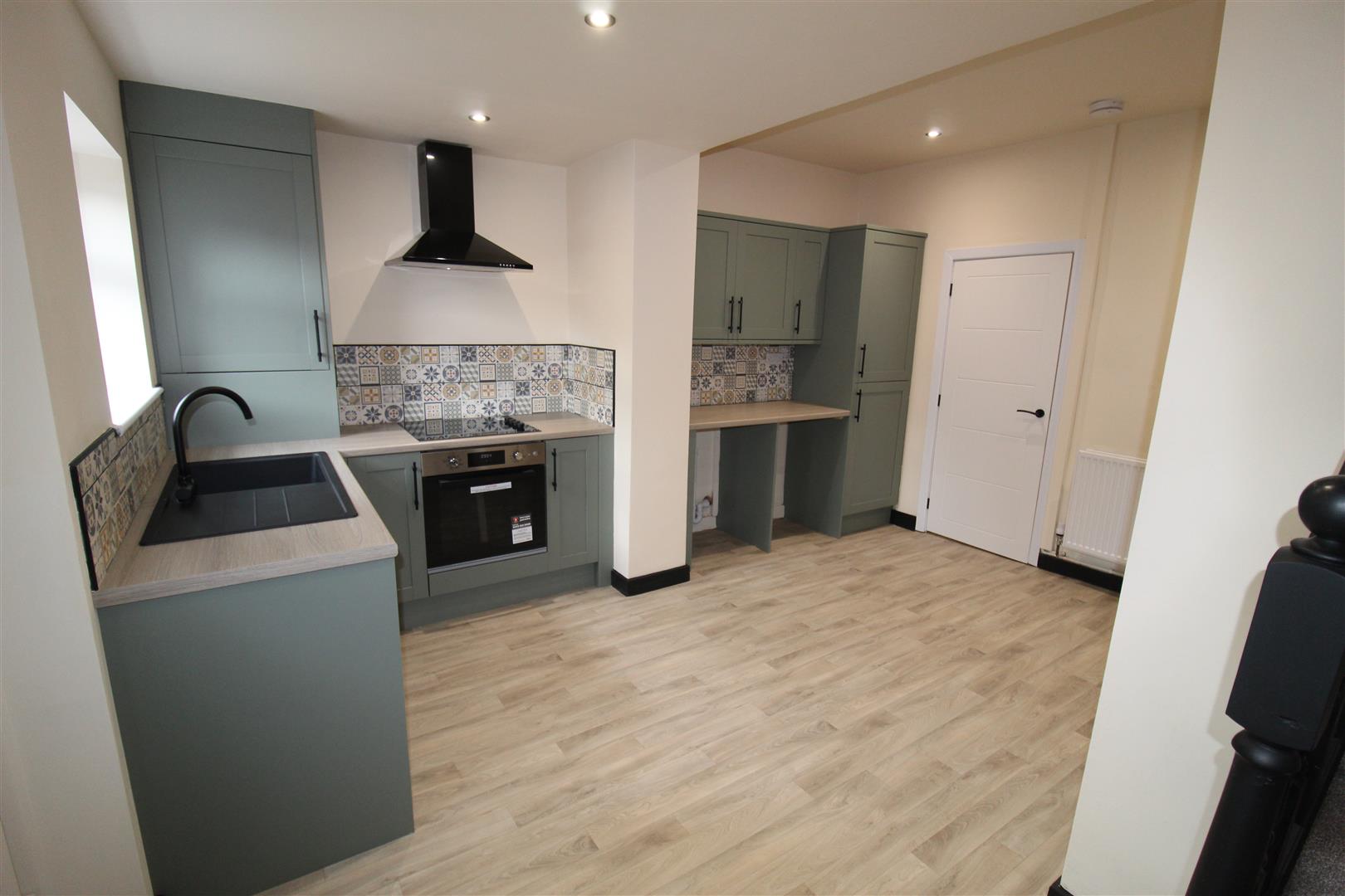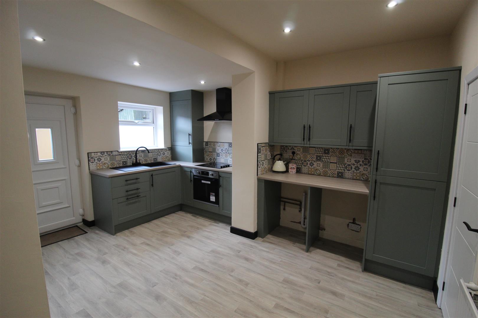 Fitted with a matching range of base and eye level units with worktop space over with drawers, cornice trims and round edged worktops, composite sink unit with single drainer, mixer tap and tiled splashbacks, plumbing for automatic washing machine, space for fridge/freezer and dishwasher, built-in electric fan assisted oven, built-in electric hob with extractor hood over, two uPVC double glazed windows to rear, double radiator, stairs, uPVC double glazed entrance door to rear.