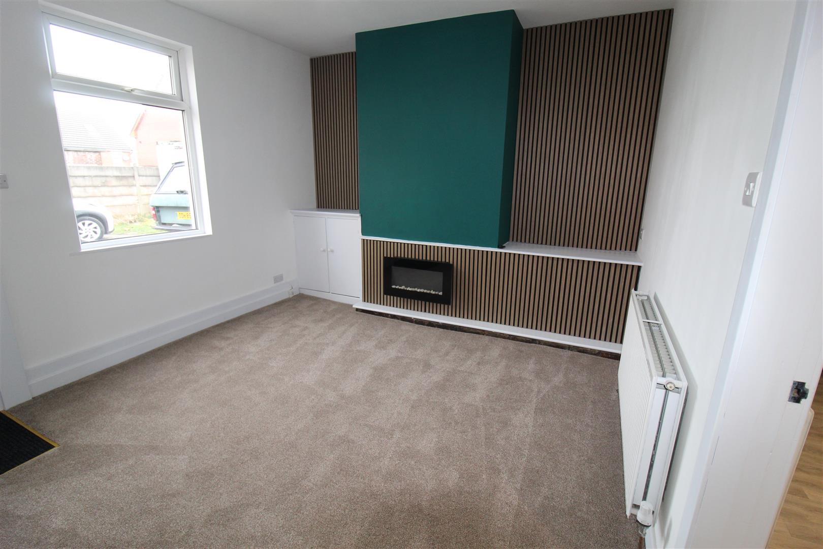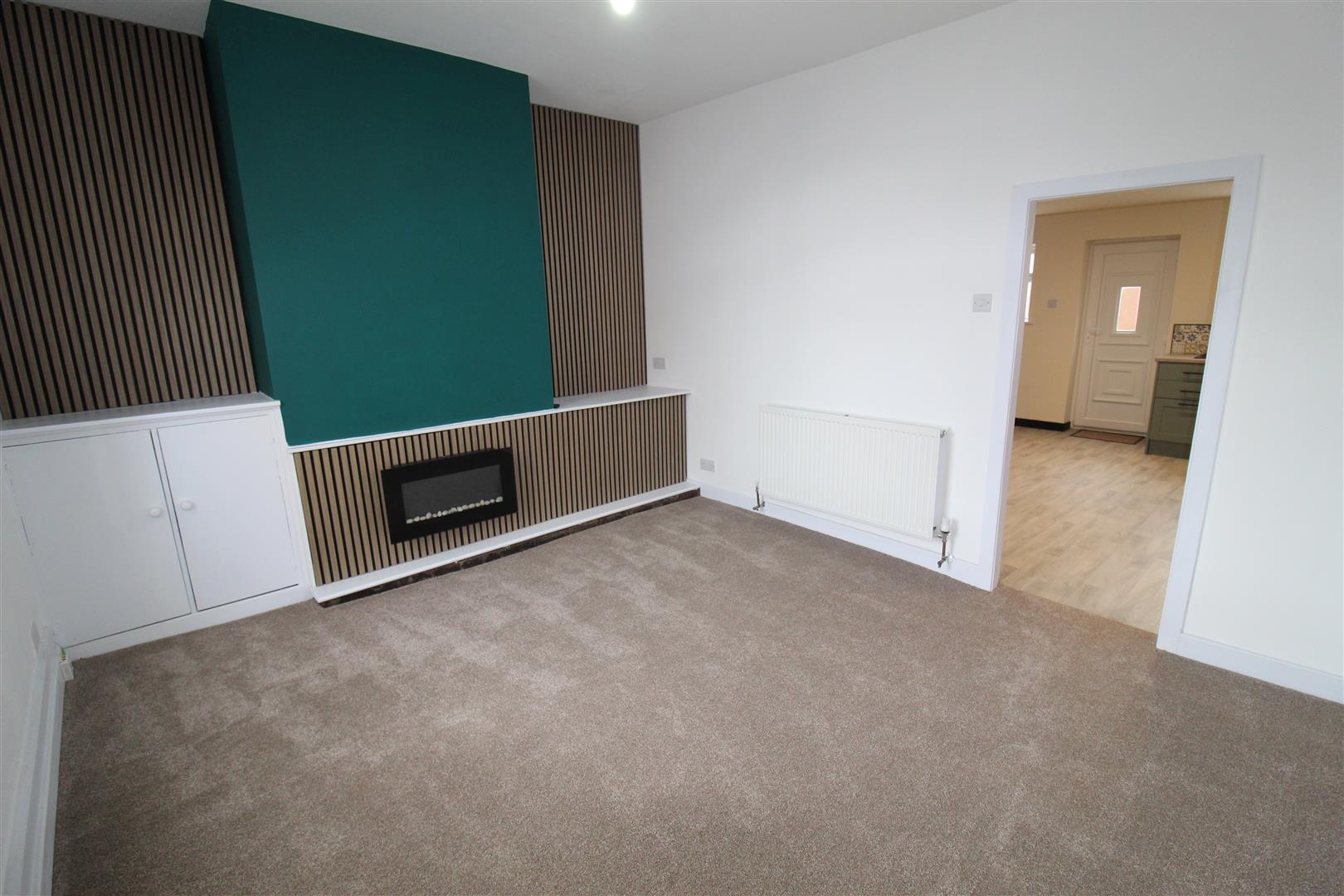 UPVC double glazed window to front, feature wall mounted electric fire set in feature surround, double radiator, uPVC double glazed entrance door to front: