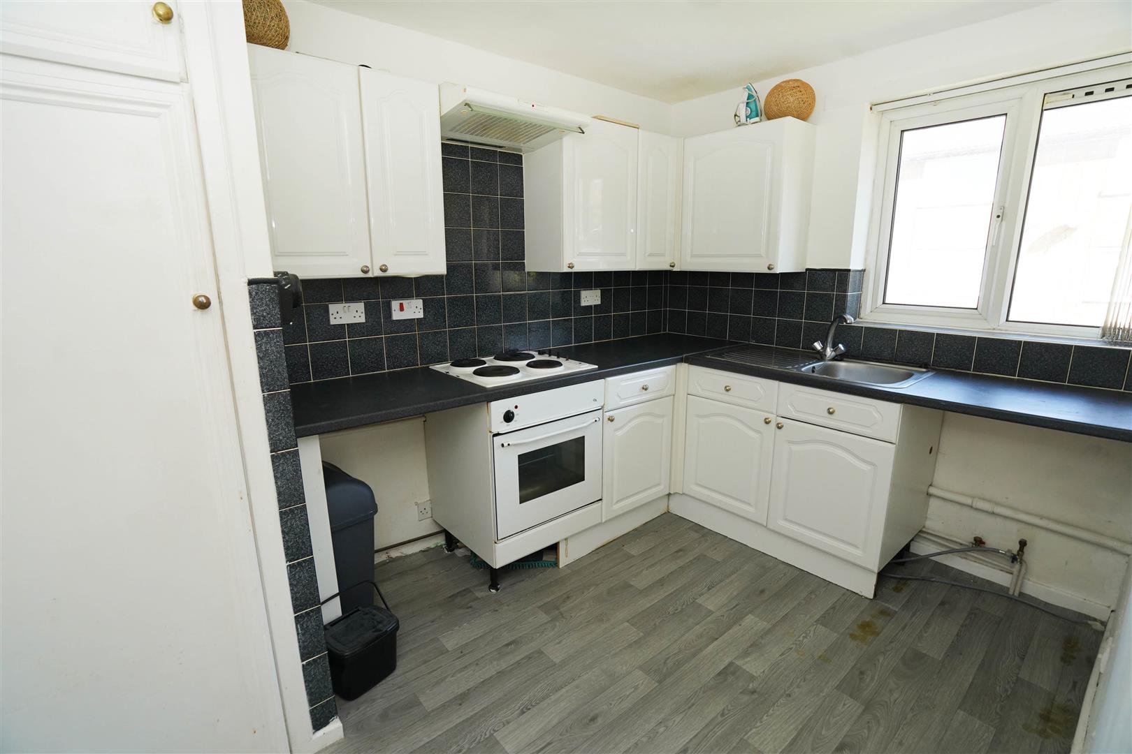 With a matching base and eye level cupboards with contrasting round edged worktops, stainless steel sink with single drainer and mixer tap with tiled splashbacks, plumbing for washing machine, space for fridge, built-in electric fan assisted oven, four ring ceramic hob with extractor hood over, uPVC double glazed window to front, built-in boiler cupboard with housing and wall mounted gas combination serving heating system and domestic hot water, radiator, vinyl flooring, door to:
