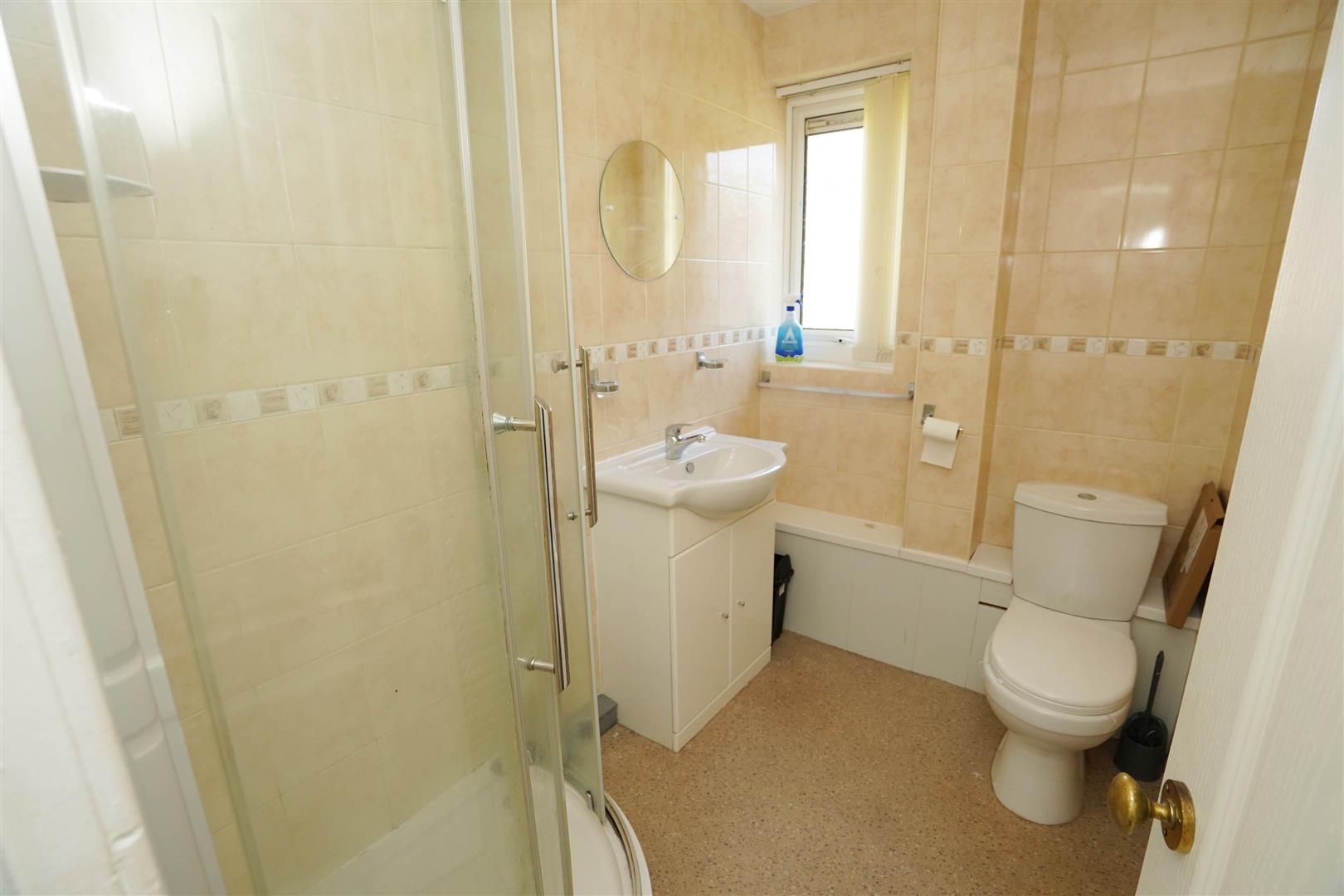 Fitted with three piece white suite with comprising, tiled shower enclosure, inset wash hand basin in vanity unit with cupboards under and mixer tap, low-level WC and heated towel rail, uPVC frosted double glazed window to front, vinyl flooring.